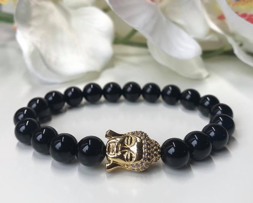 Arany Buddha Cirkon köztessel díszített /Fekete Achát Ásványos Karkötő