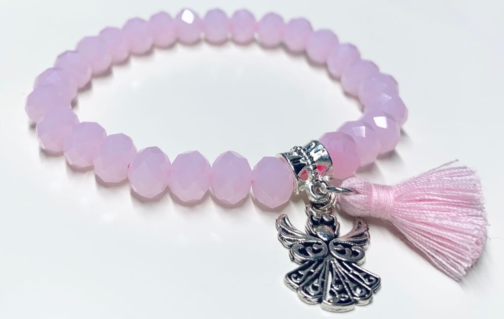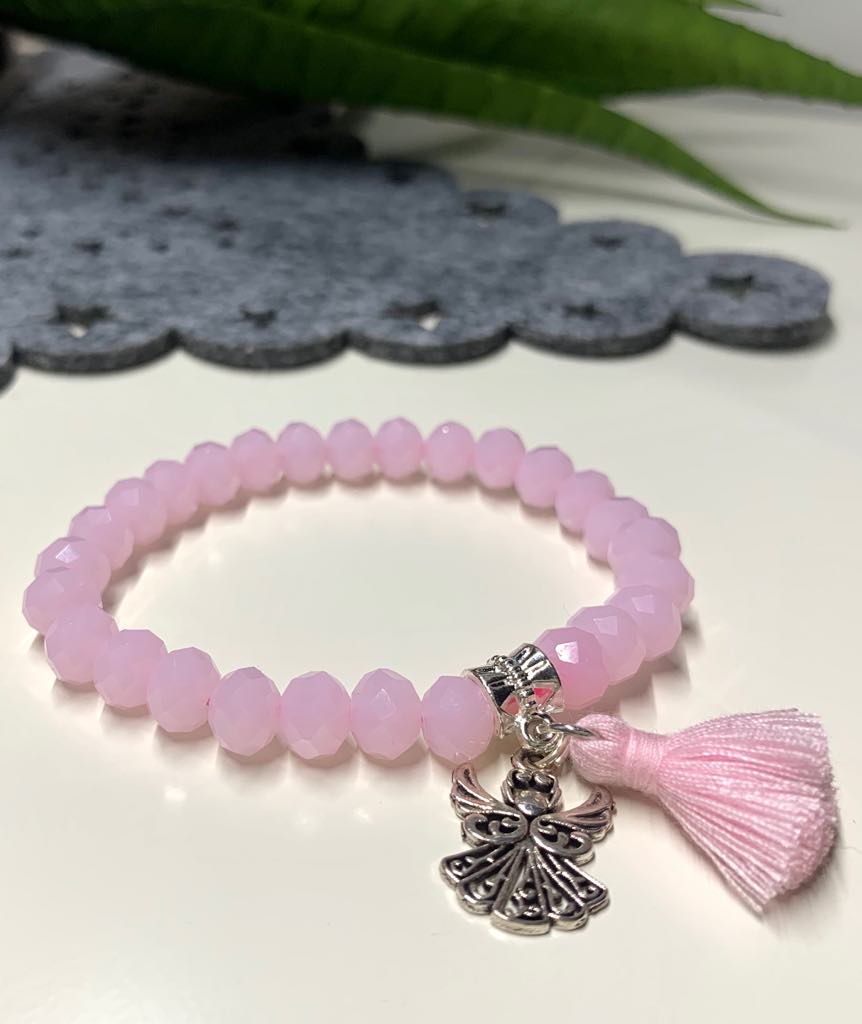 Baba Rózsaszín abacus üveggyöngy karkötő, angyalkával,és pomponnal