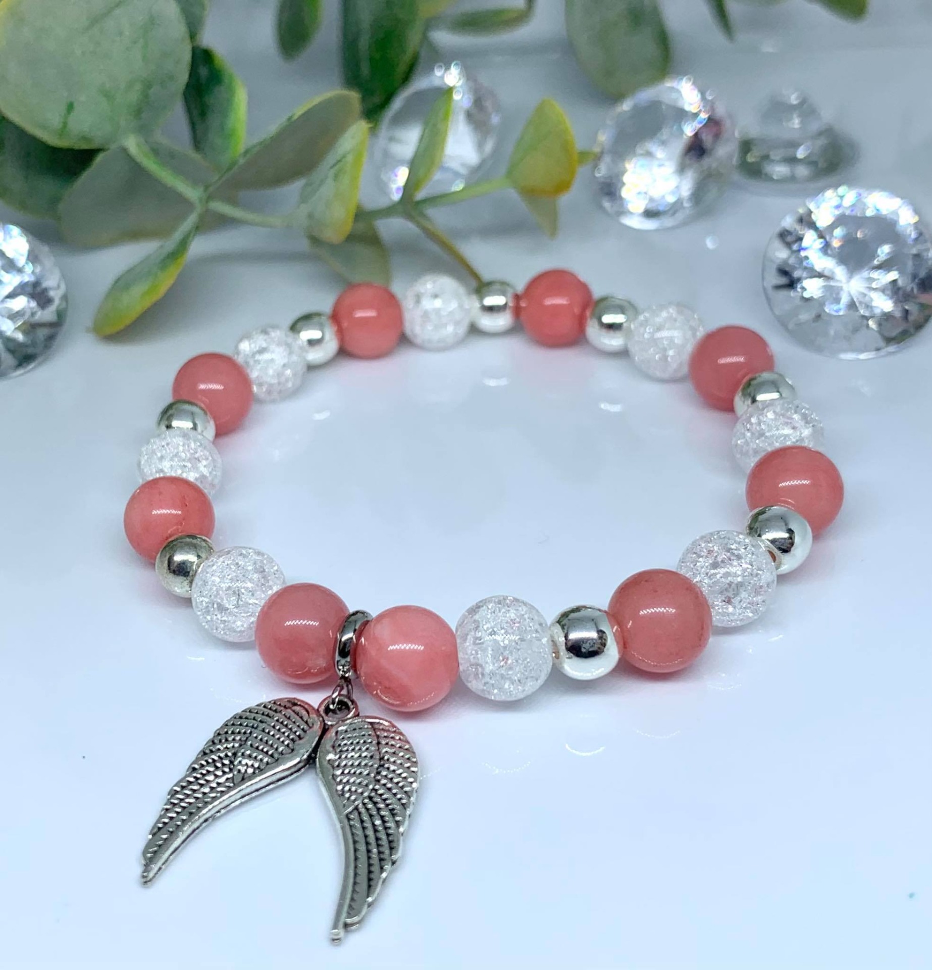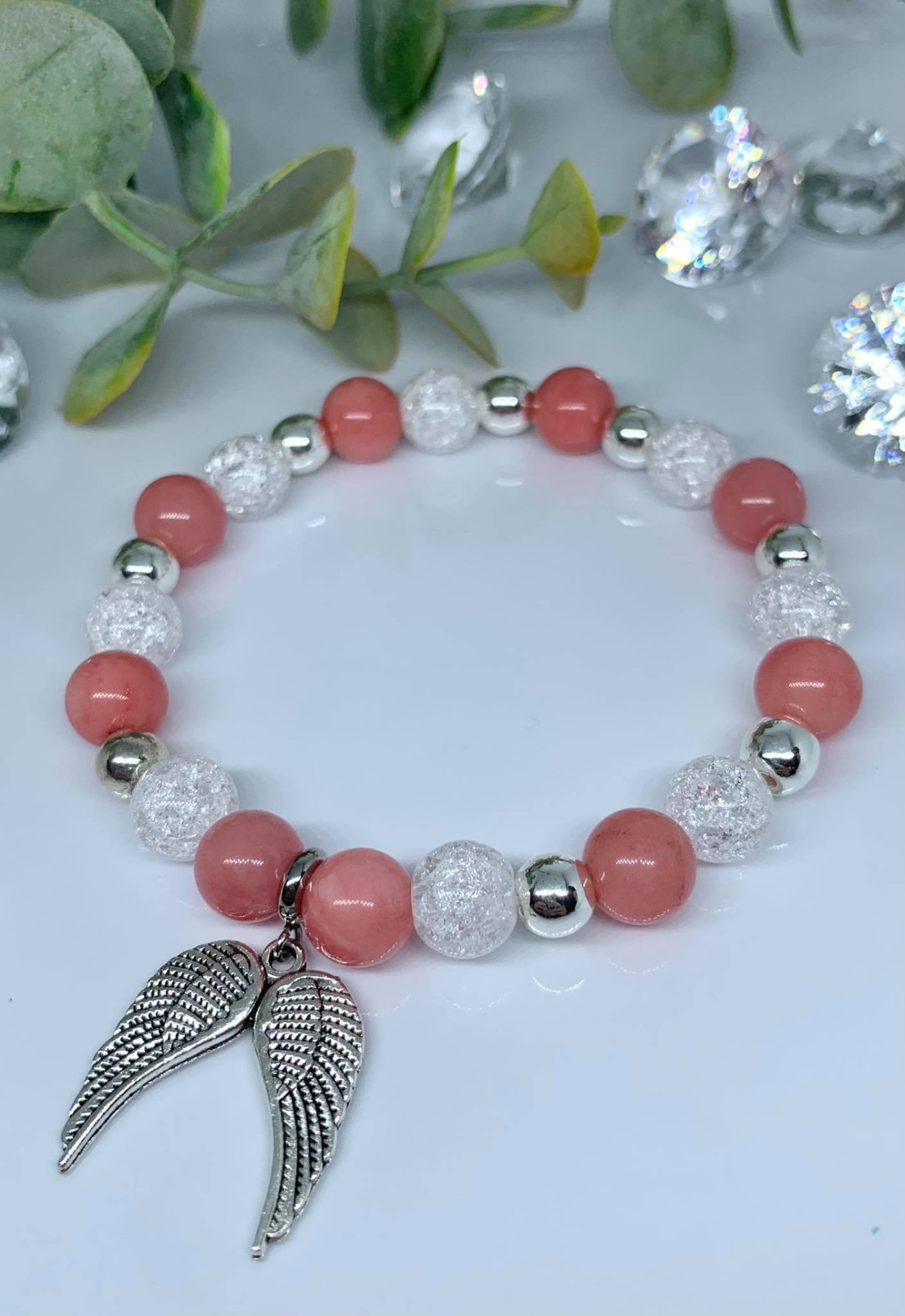 - Ásvány: Jade (barack), Hegyikristály (roppantott) és Hematit (ezüst színű festett, 6mm-es)