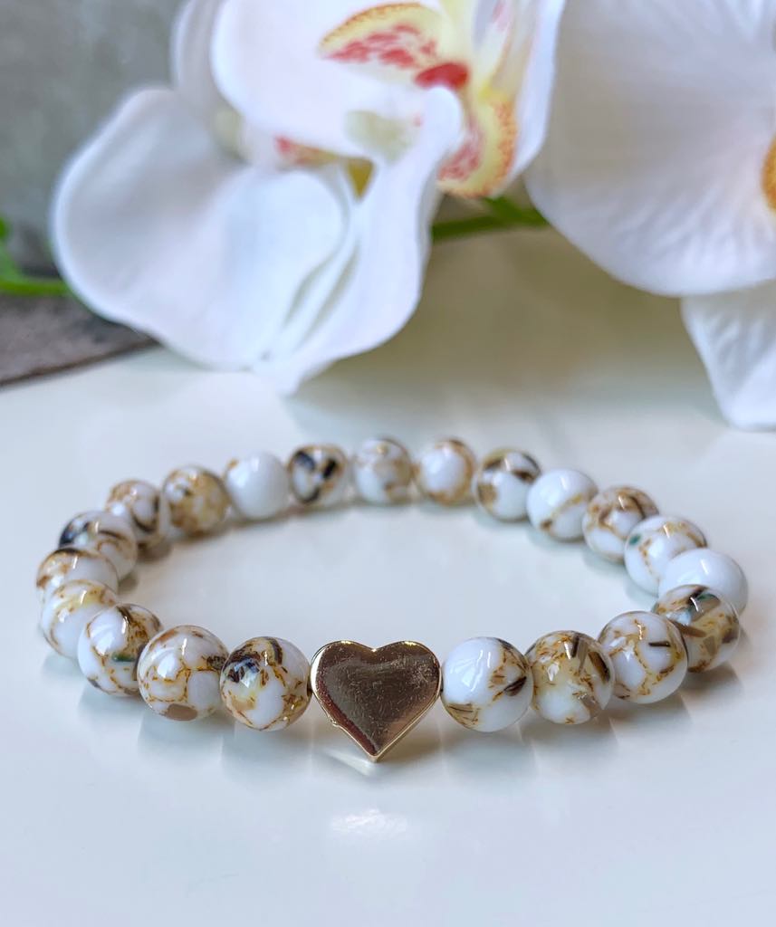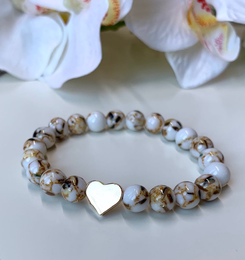 Fehér-Arany Préselt Kagylógyöngy Karkötő- Arany szív köztessel díszítve