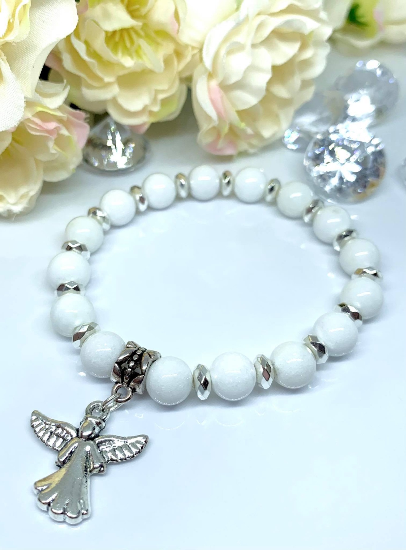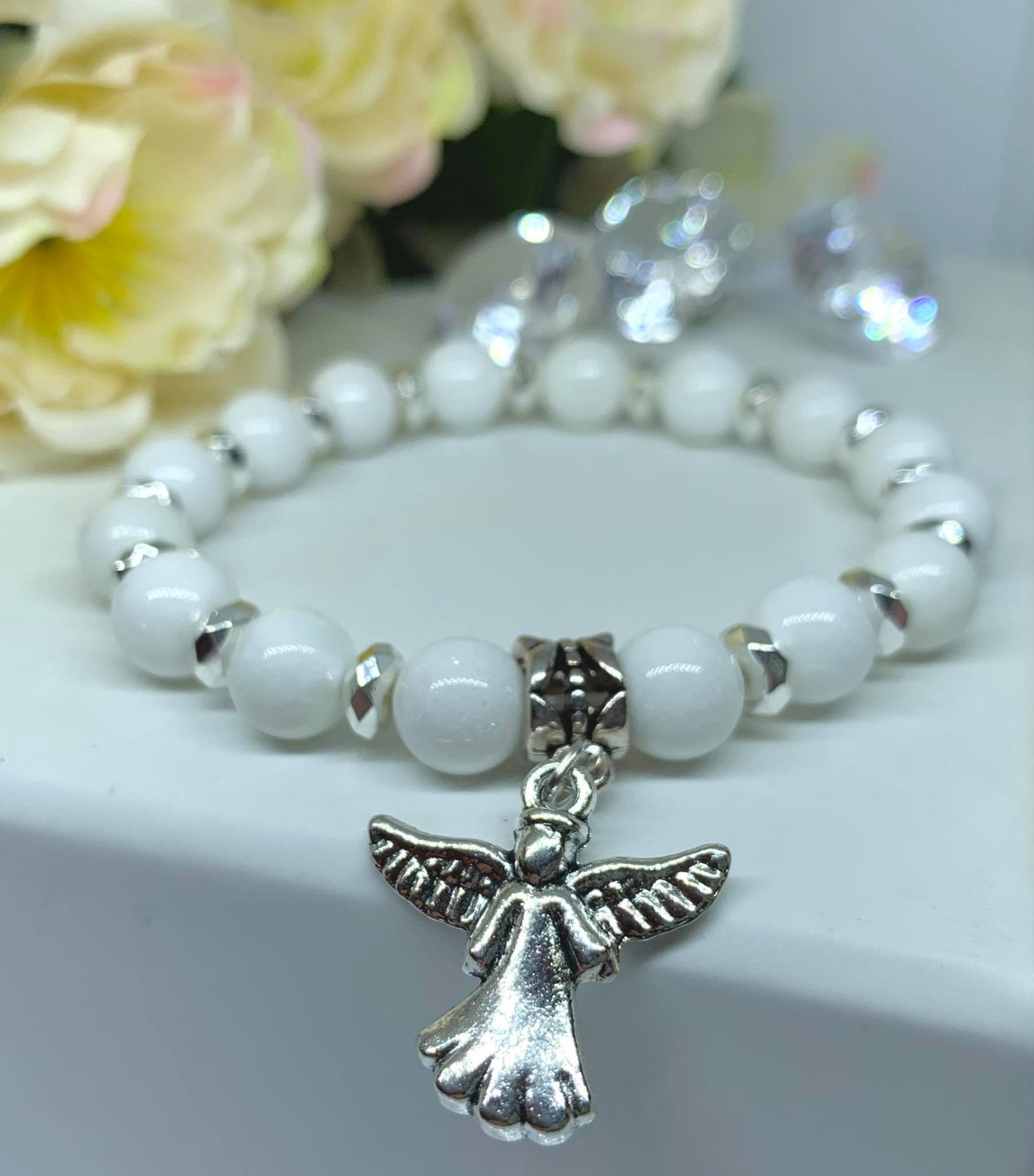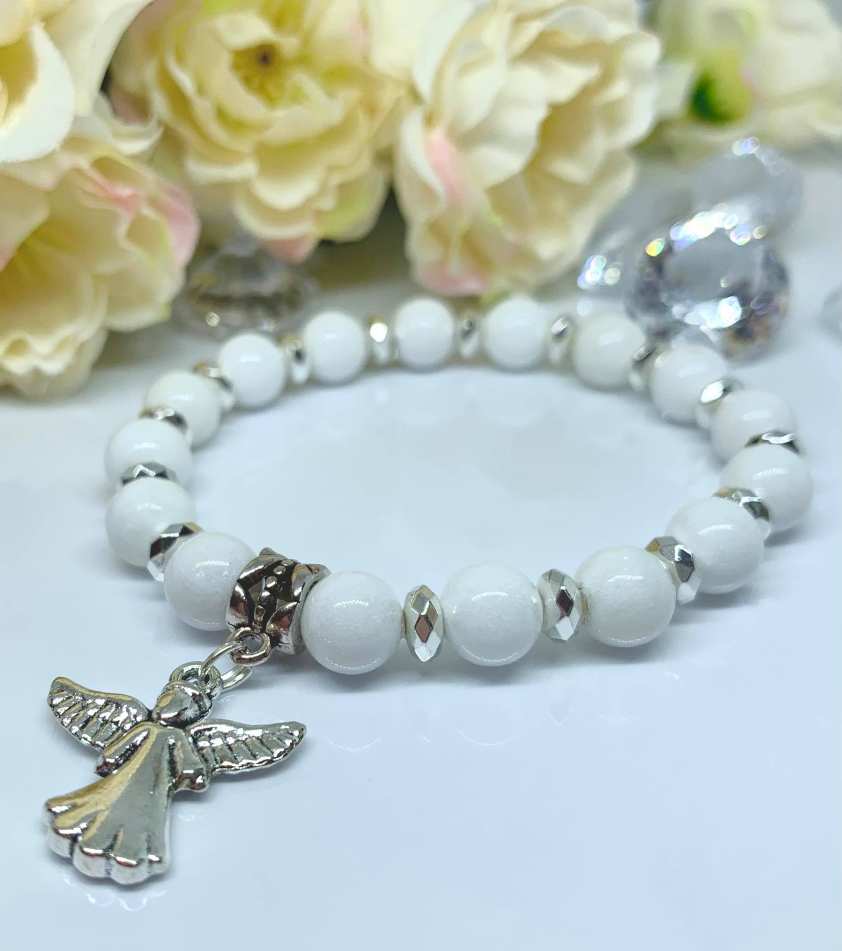 Fehér Jade Ásvány Karkötő, Ezüst Hematit köztesekkel és Angyal Charm díszítéssel