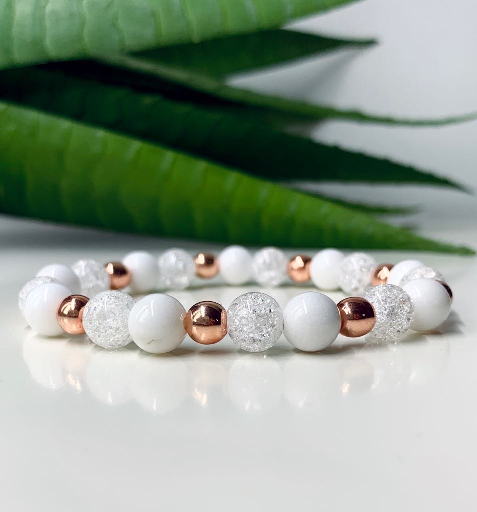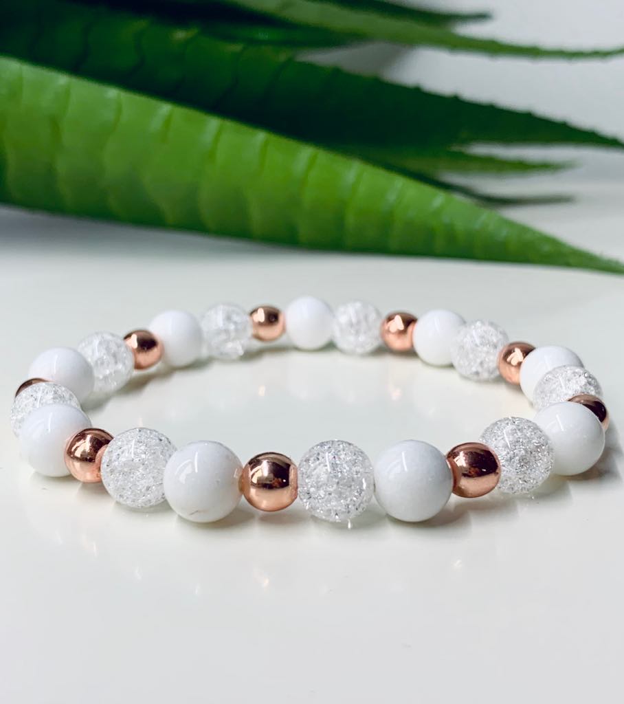 Fehér Jade & Hegyikristály Ásvány Karkötő, RoseGold Hematittal díszítve