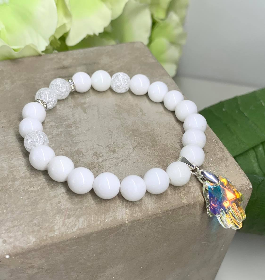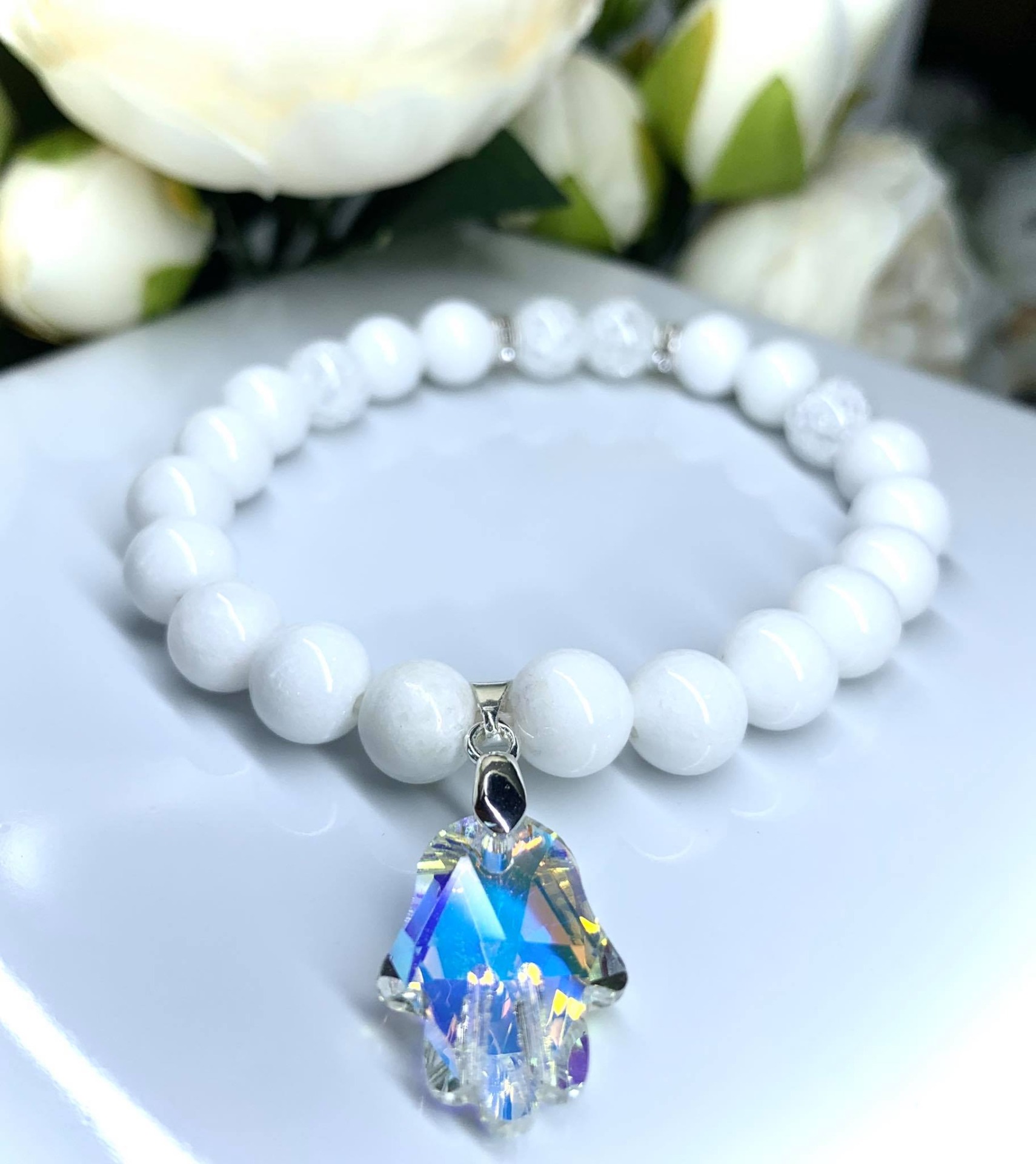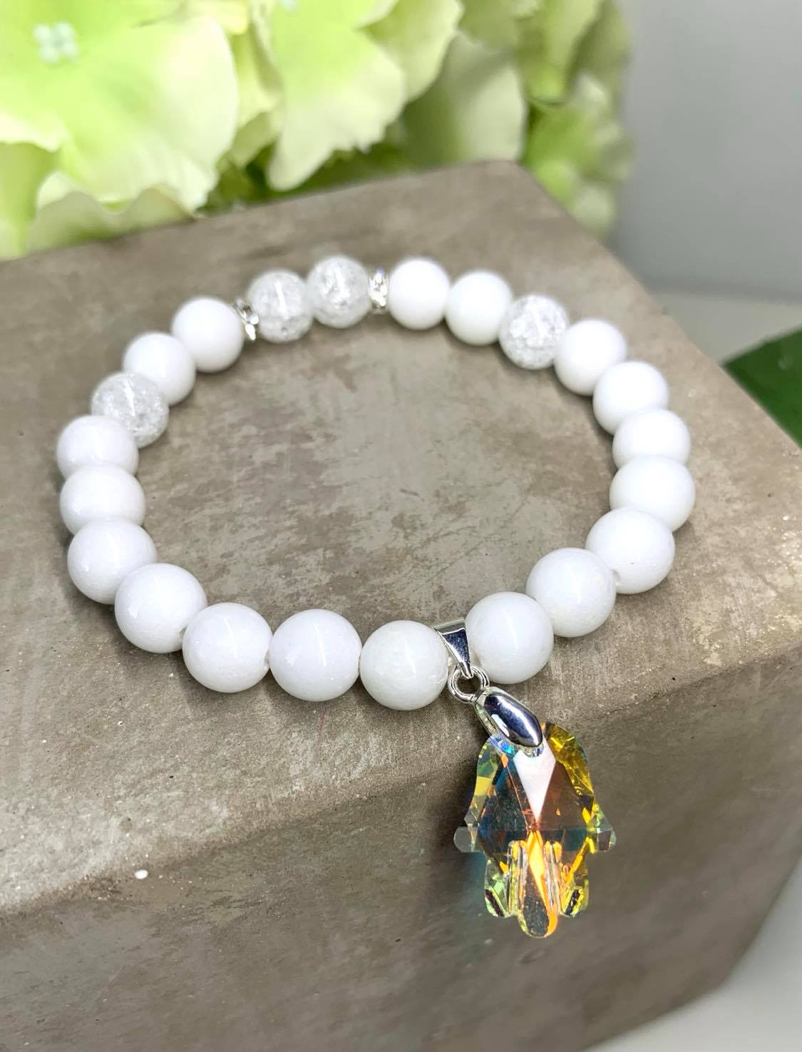 FehérJade & Hegyikristály Ásvány Karkötő - Hamza csiszolt üveg medállal