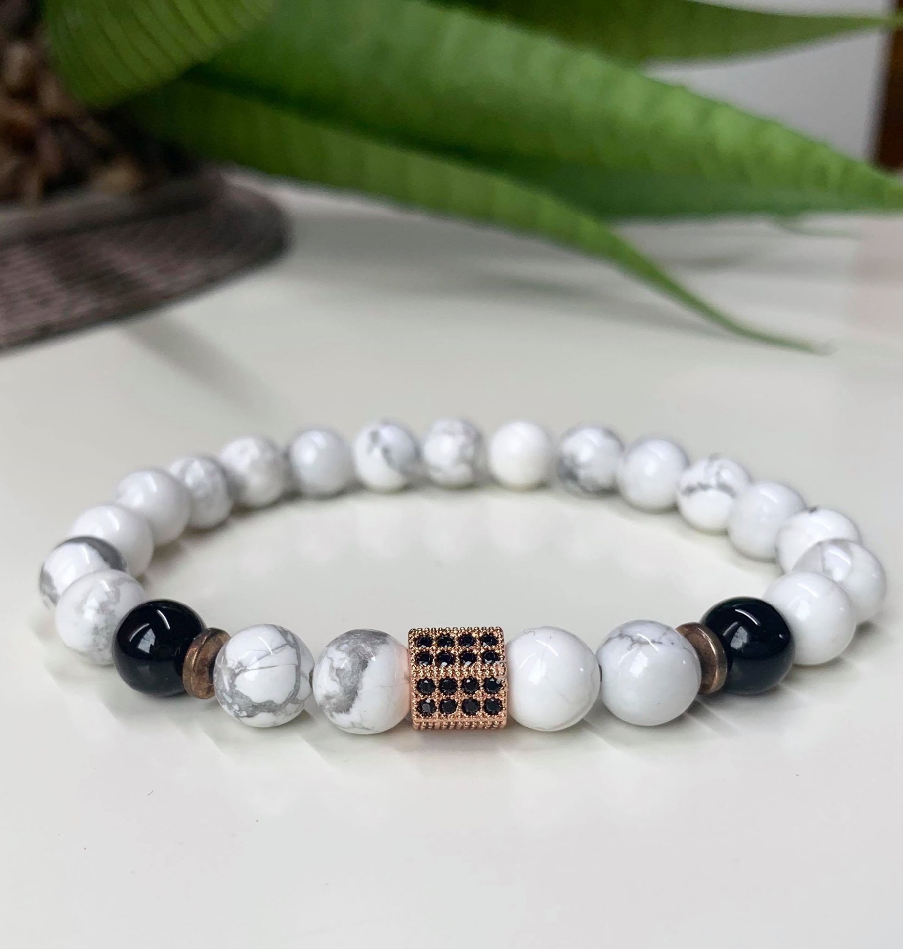 Howlit és Onix Ásvány Karkötő - Rose Gold Cirkonnal díszítve