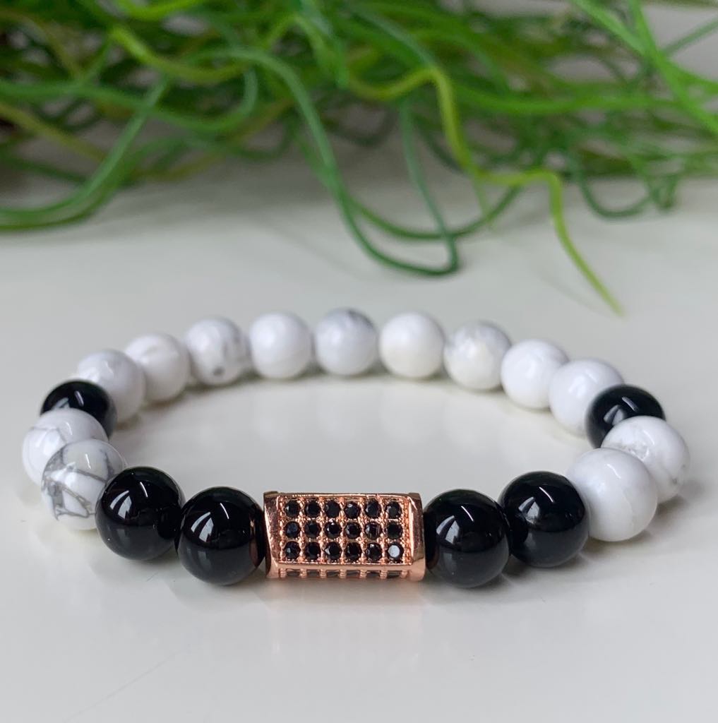 Howlit & Fekete Achát Ásványos Karkötő, Rose Gold Cirkonos köztessel
