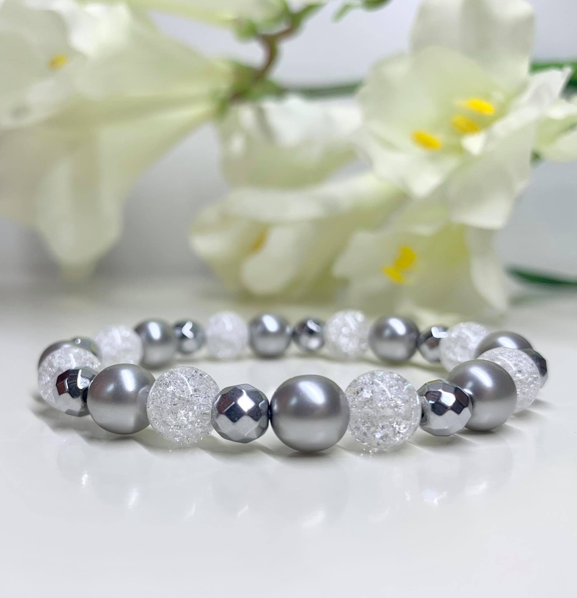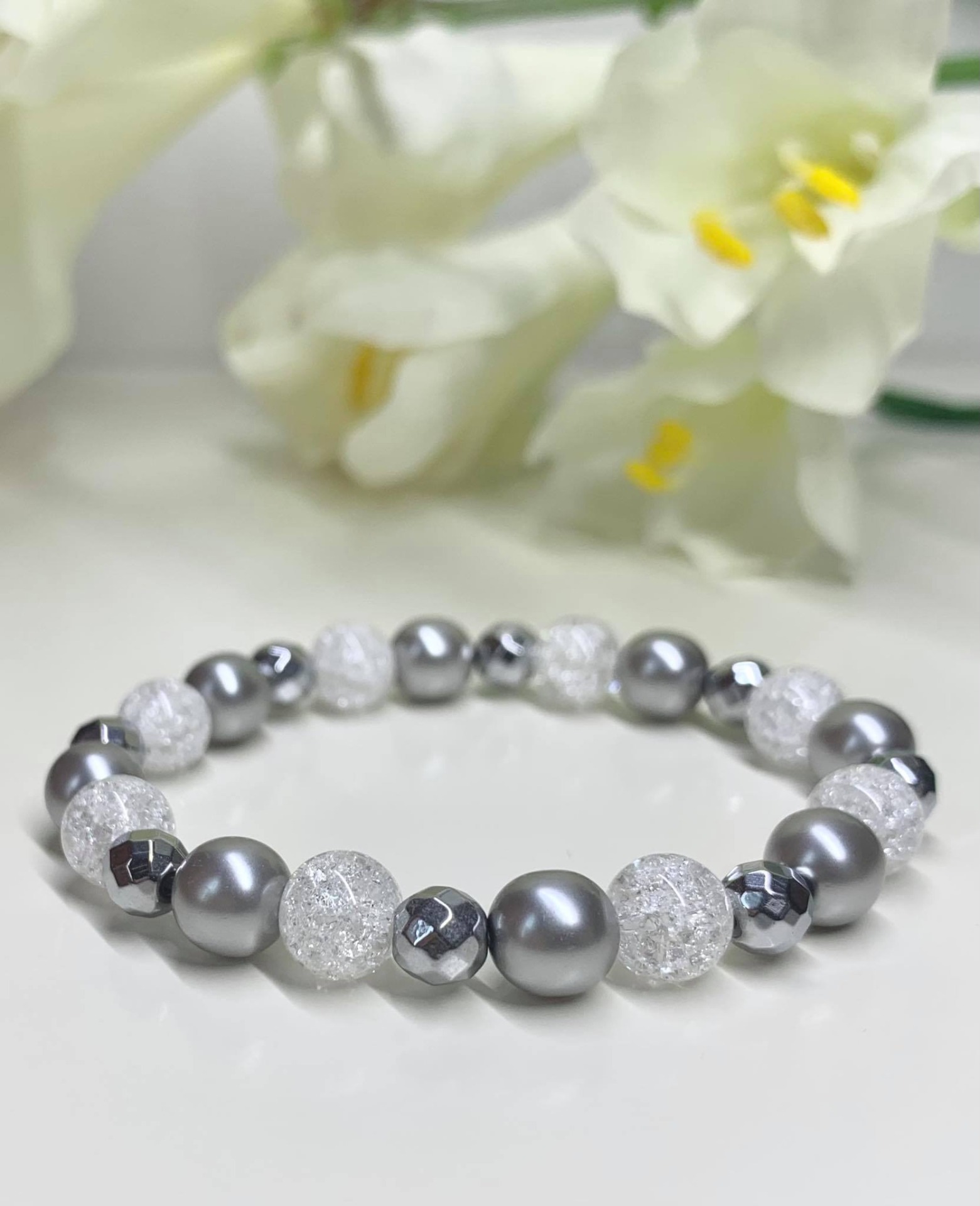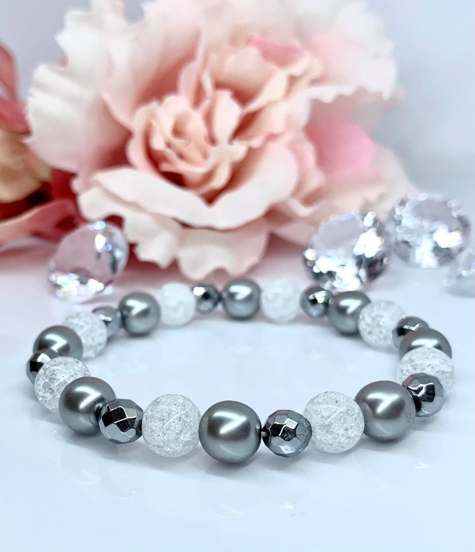 Jeges szürke Ásvány Karkötő / Hegyikristály,Hematit,és Preciosa/