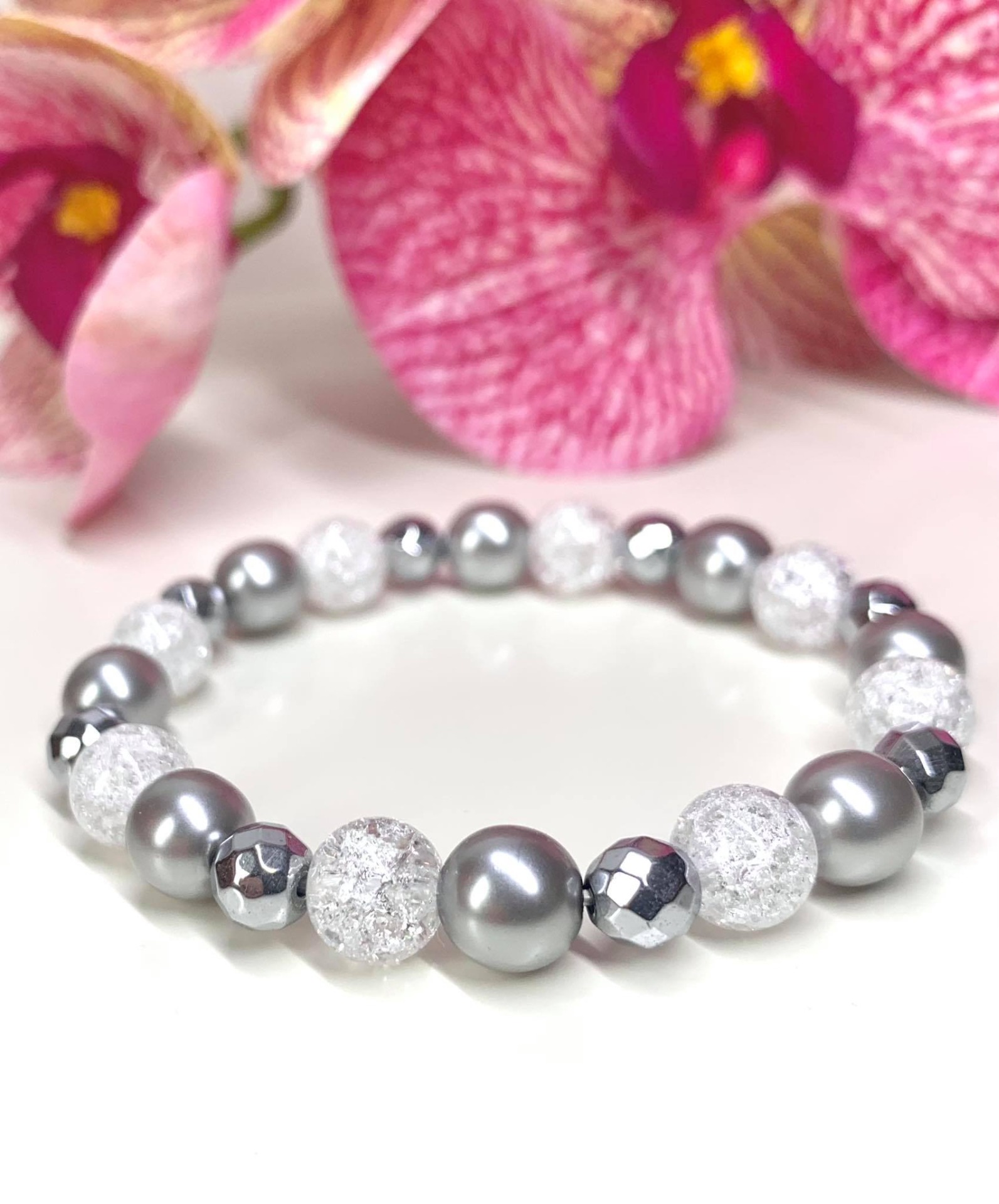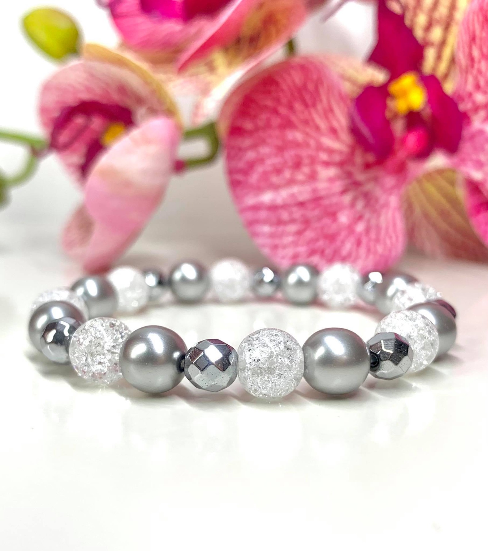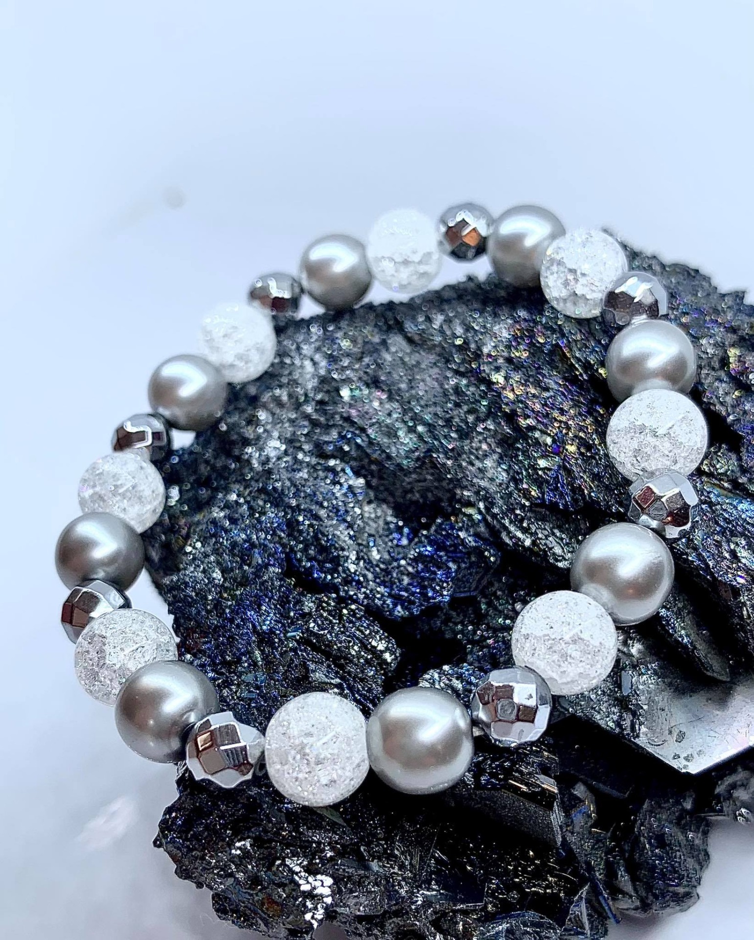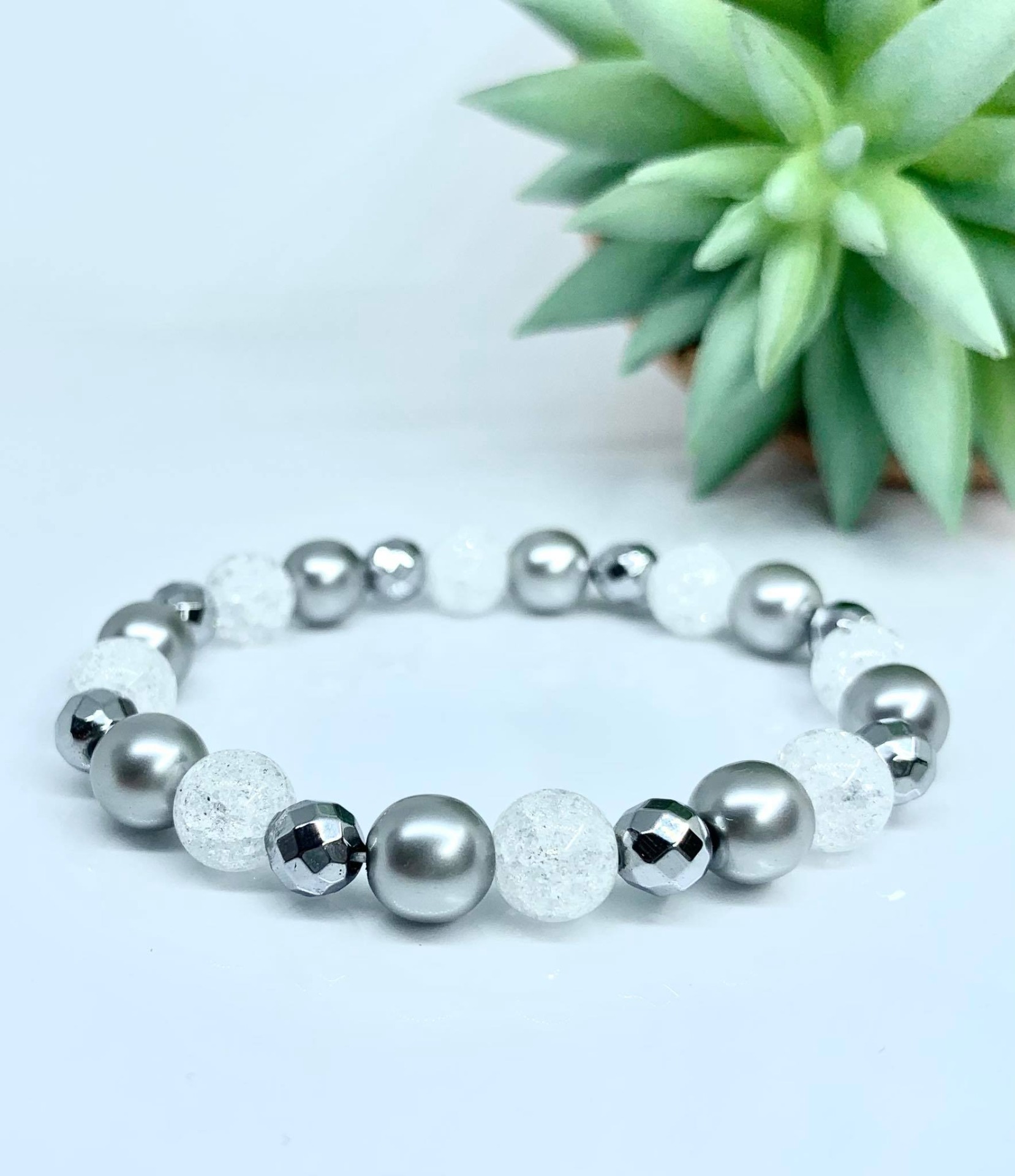 Jeges szürke Ásvány Karkötő / Hegyikristály,Hematit,és Preciosa/