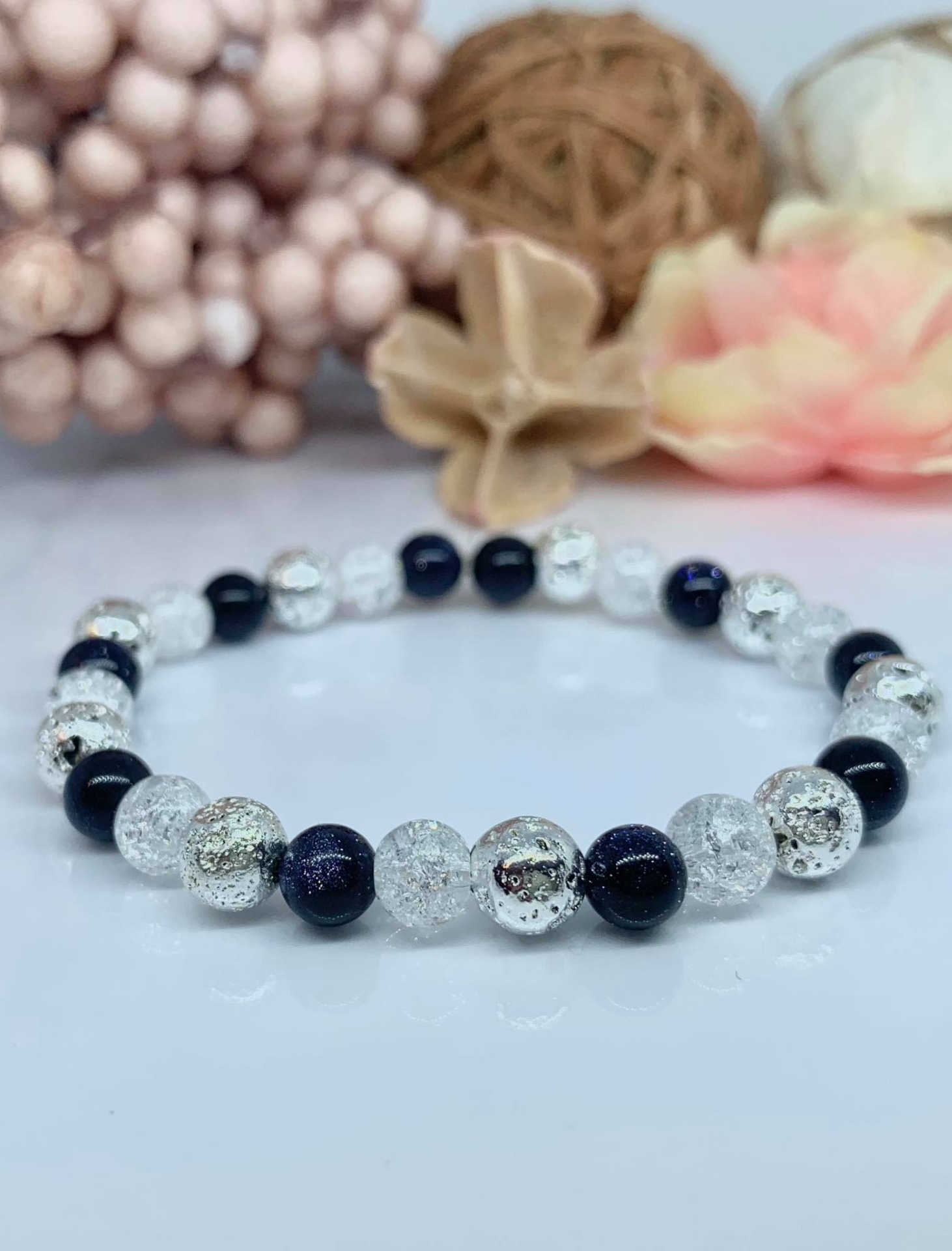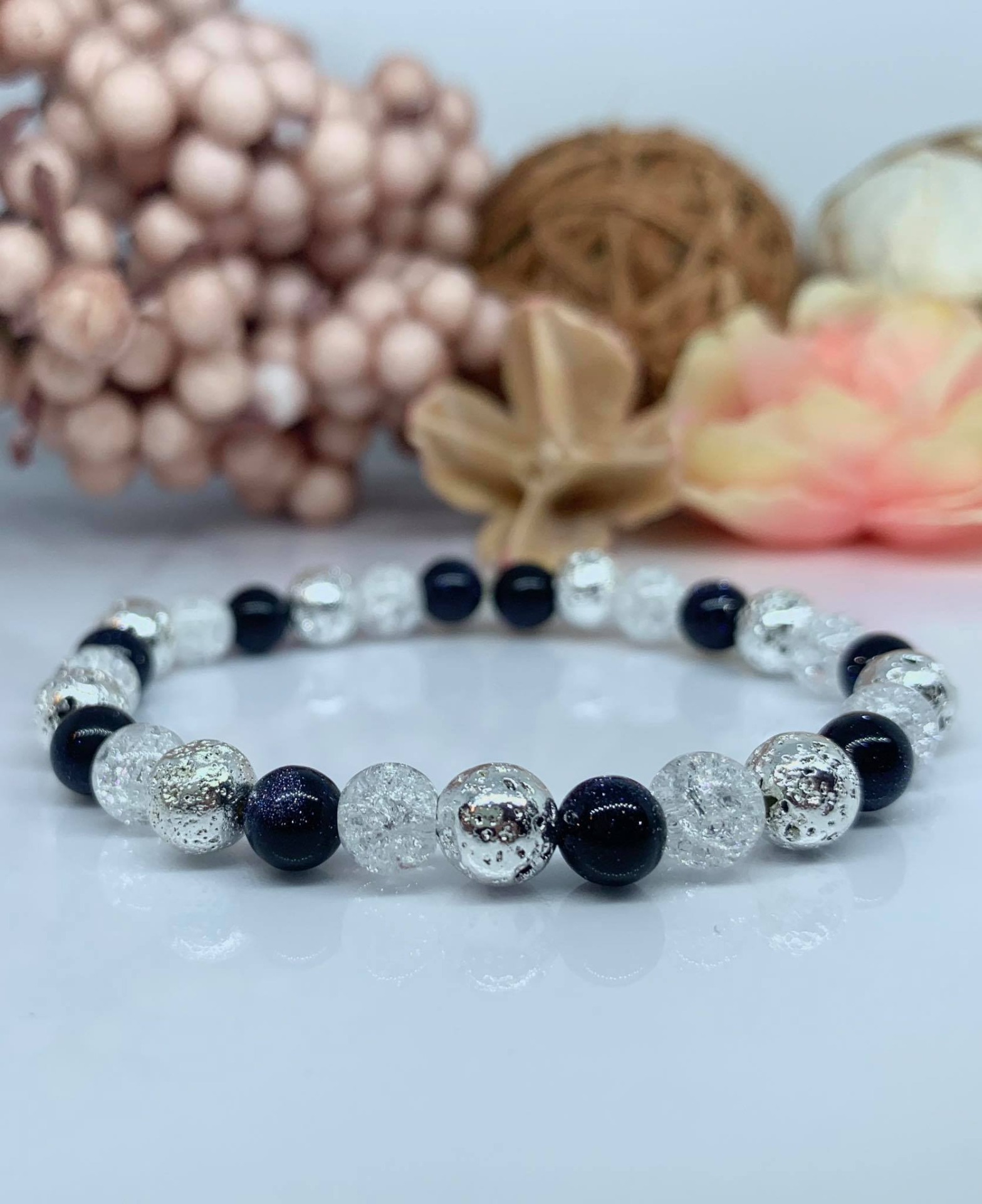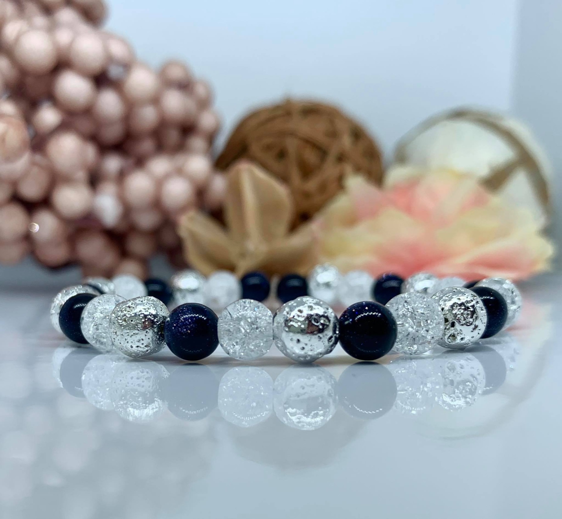 Kék csillámló napkő, Hegyikristállyal és Ezüst Lávakővel kombinált Ásvány Karkötő (mini gyöngyös)
