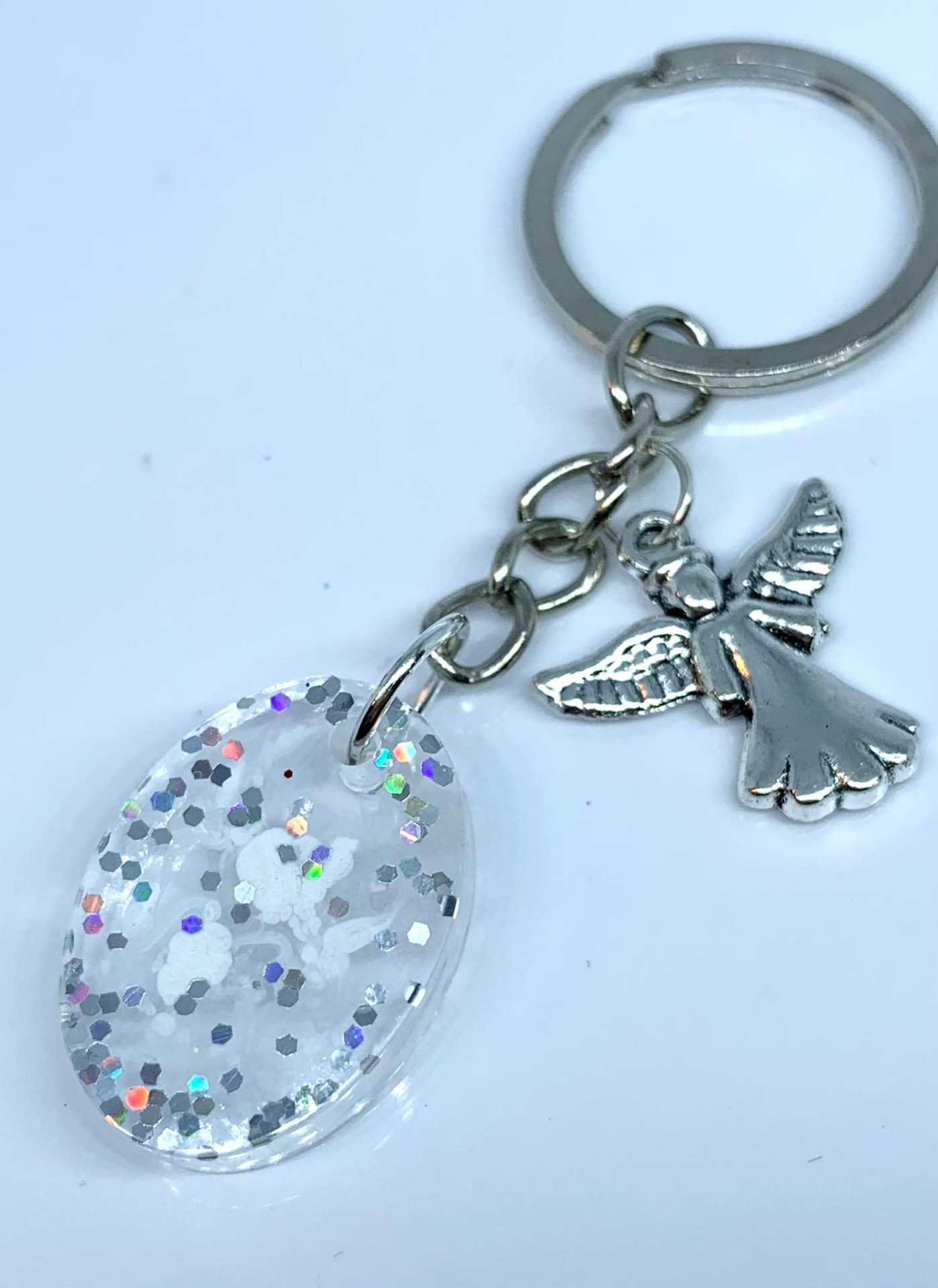 Műgyanta kulcstartó - átlátszó,csillámos,-ovális alakú, angyalkával 2