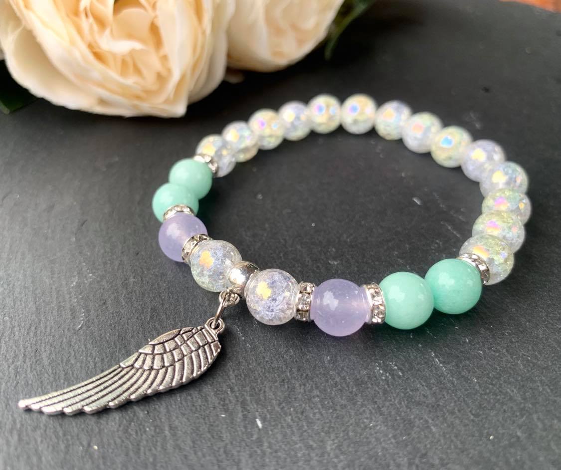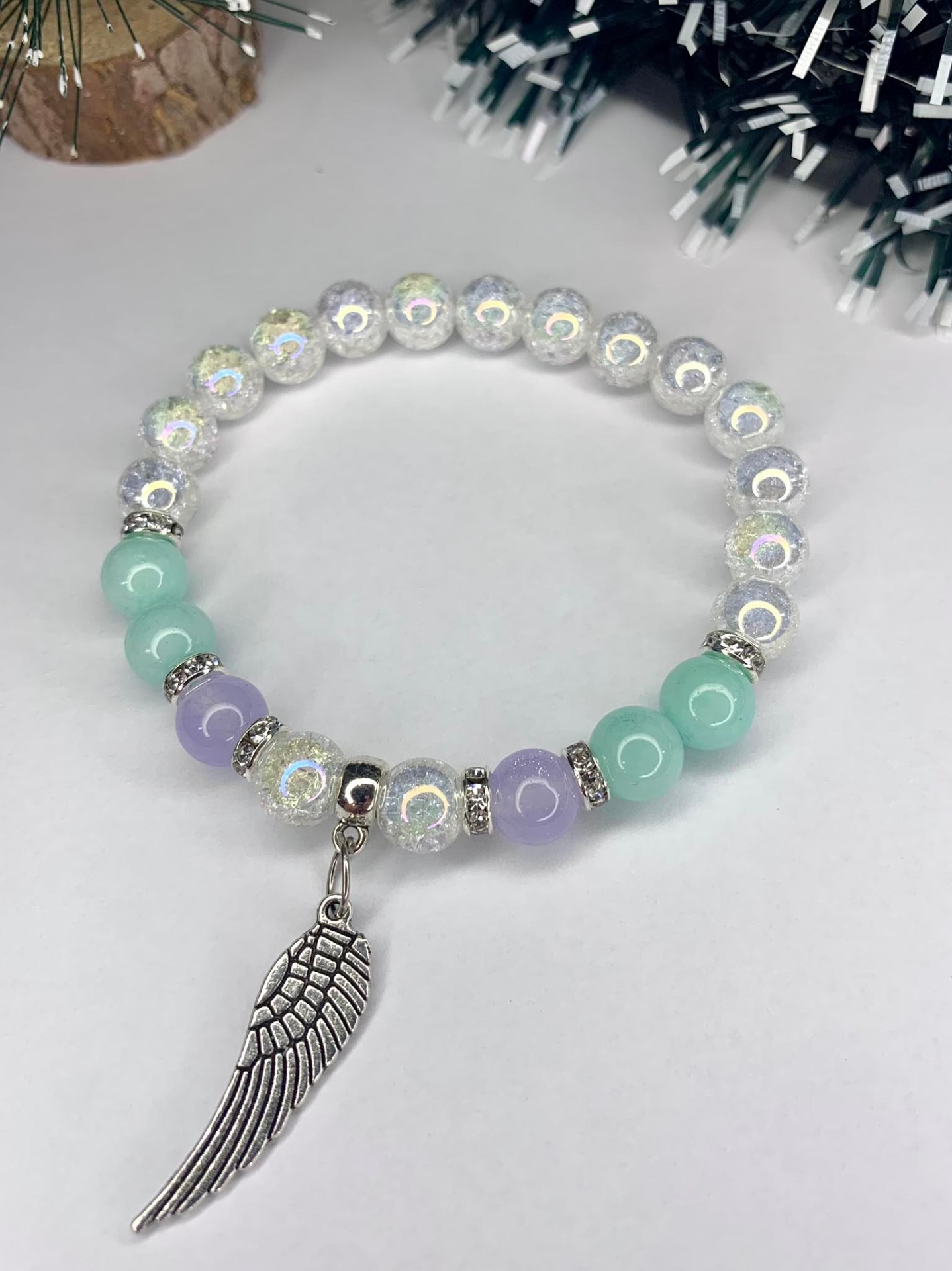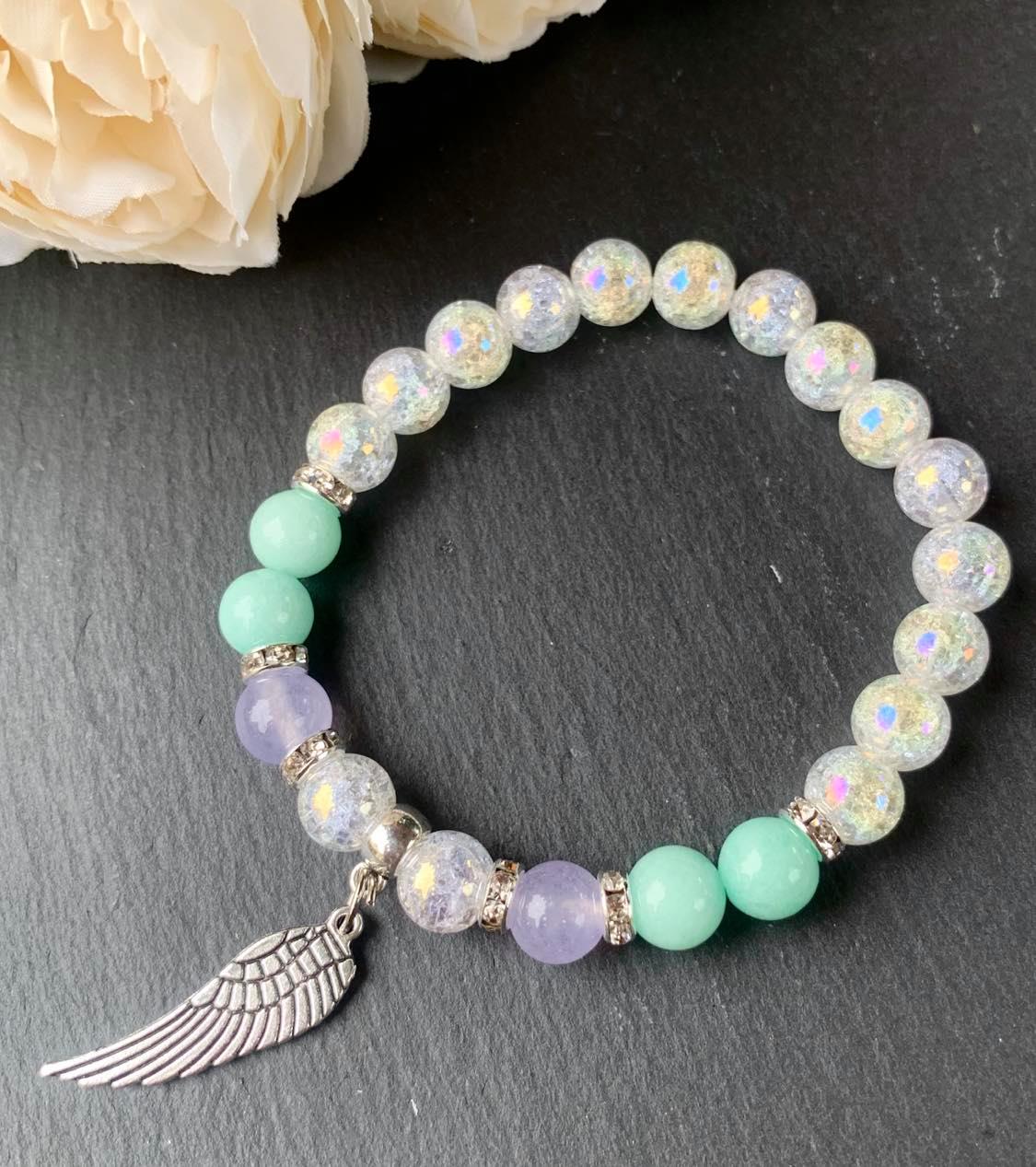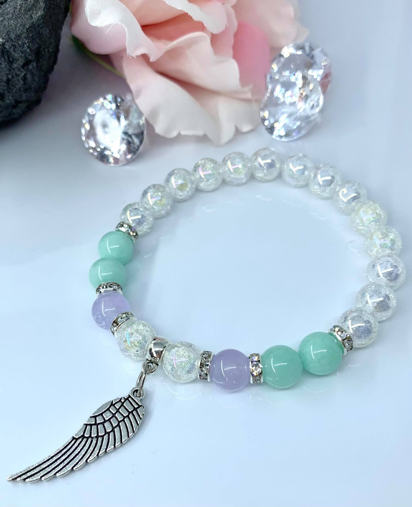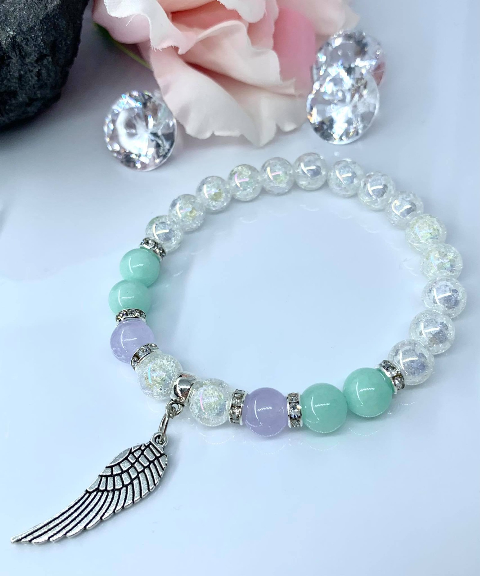 Nagy Angyalszárnyas Karkötő, Csillámló Hegyikristály Ásványbó (lila,menta)
