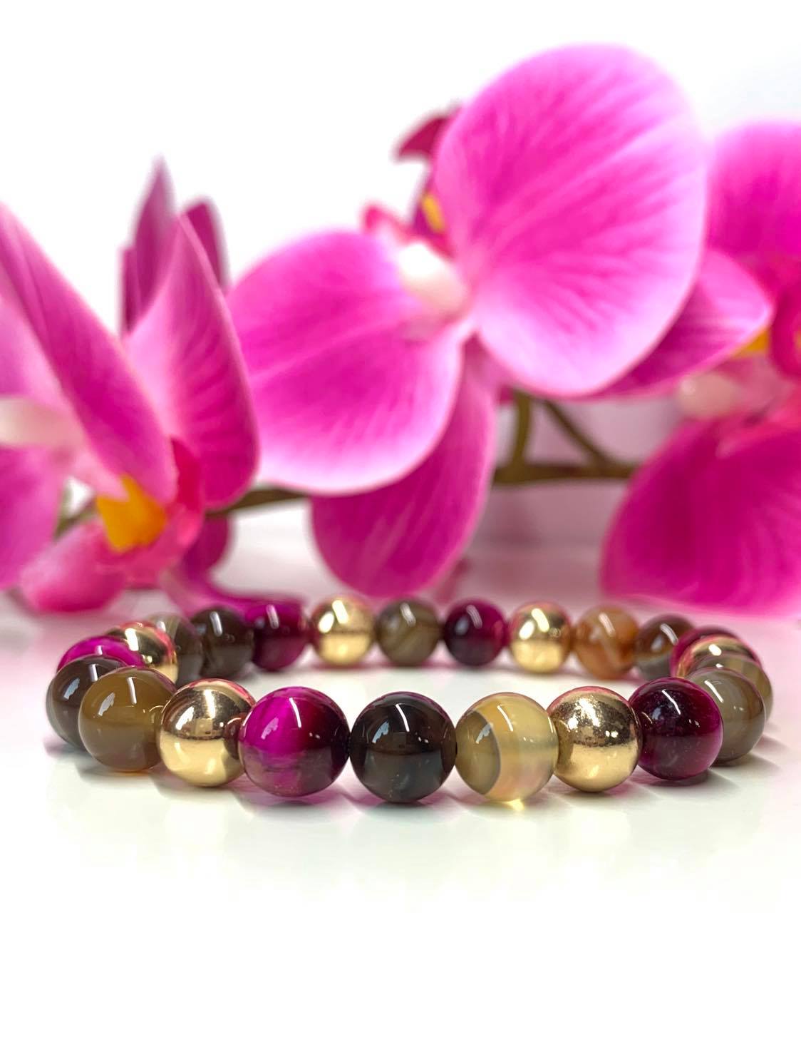 - Ásvány : Tigrisszem (magenta), Achát (barna csíkos) és Hematit (arany színű)
