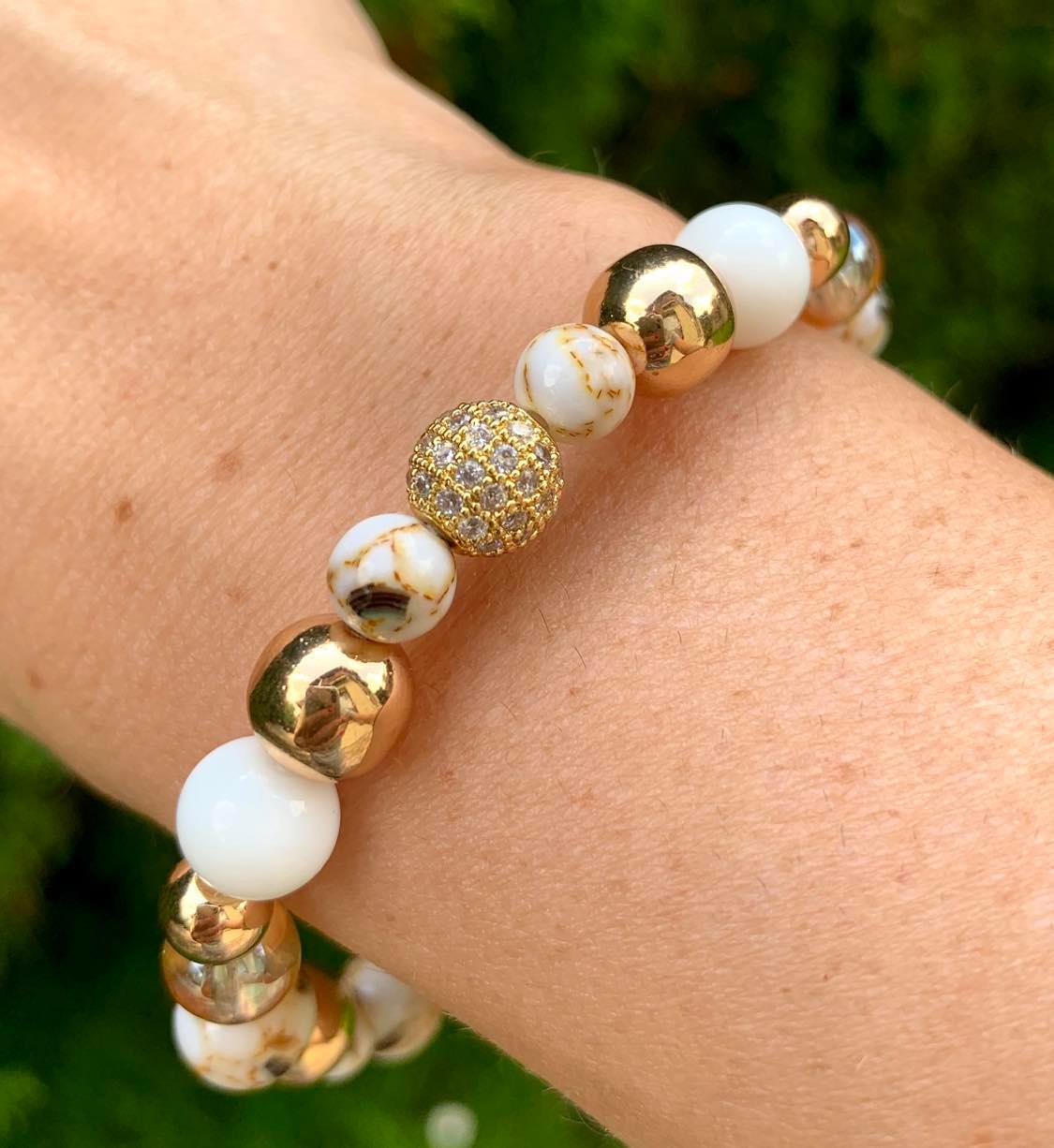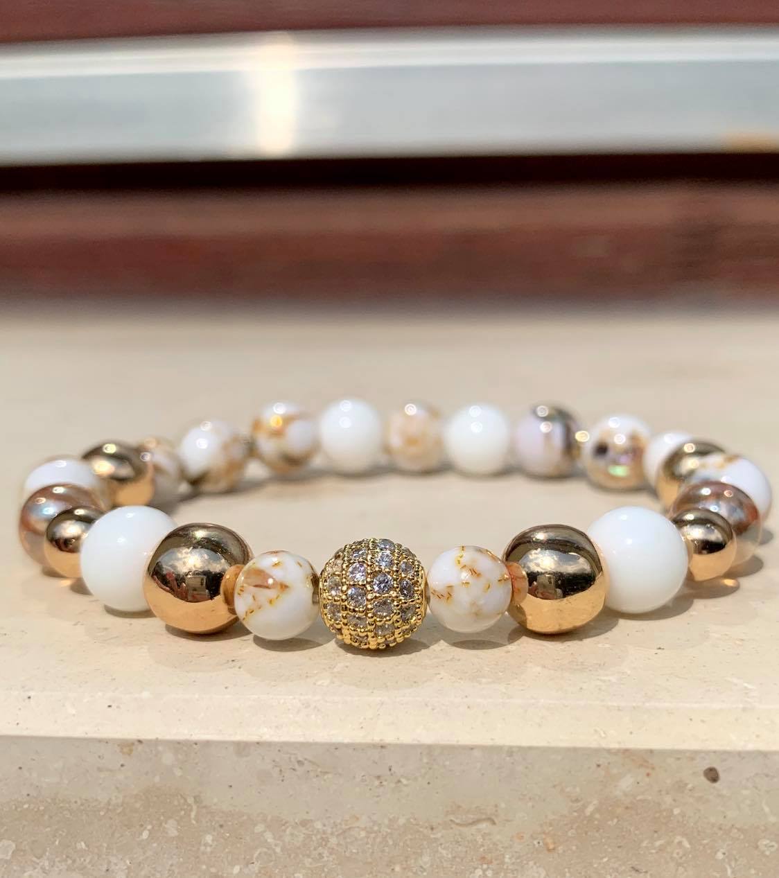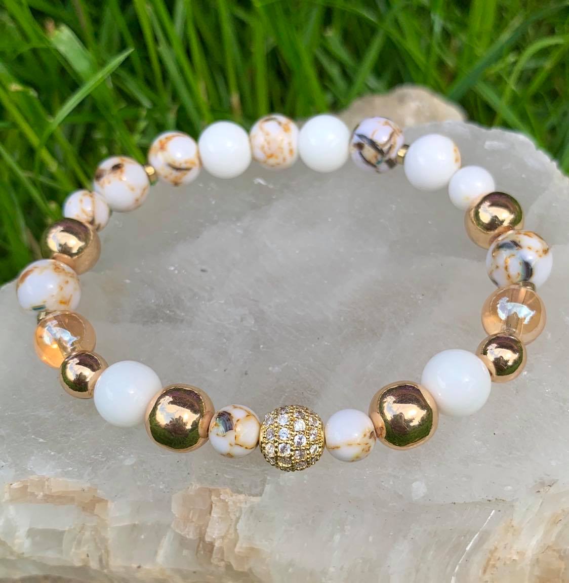 - Ásvány: Tört kagylógyöngy, Hematit (arany színű festett, 6-és 8mm-es gyöngyök), Arany színű hegyikristály, Fehér Jade
