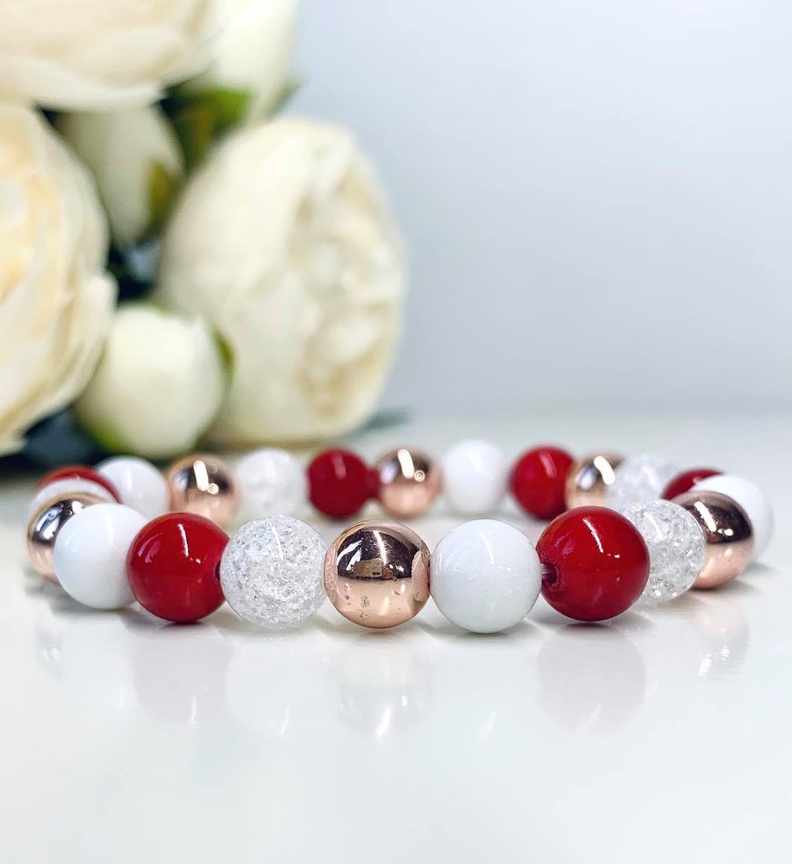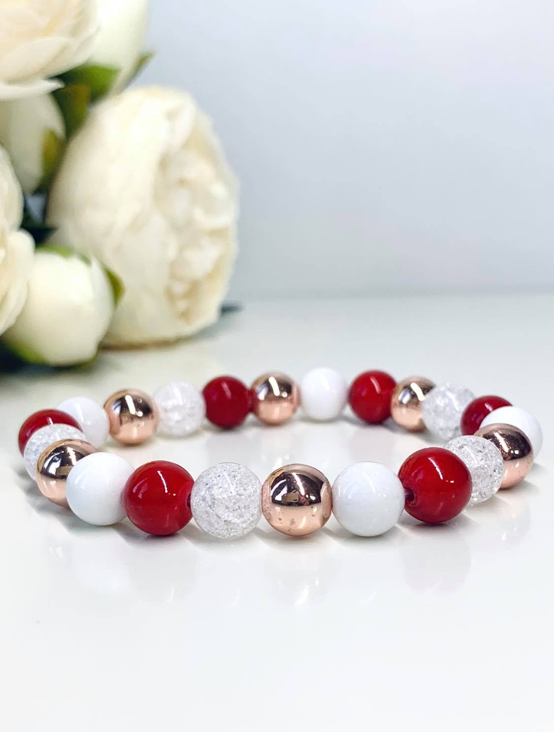 Piros - Fehér Jade Ásvány karkötő / RoseGold Hematittal,és Hegyikristállyal kombinálva