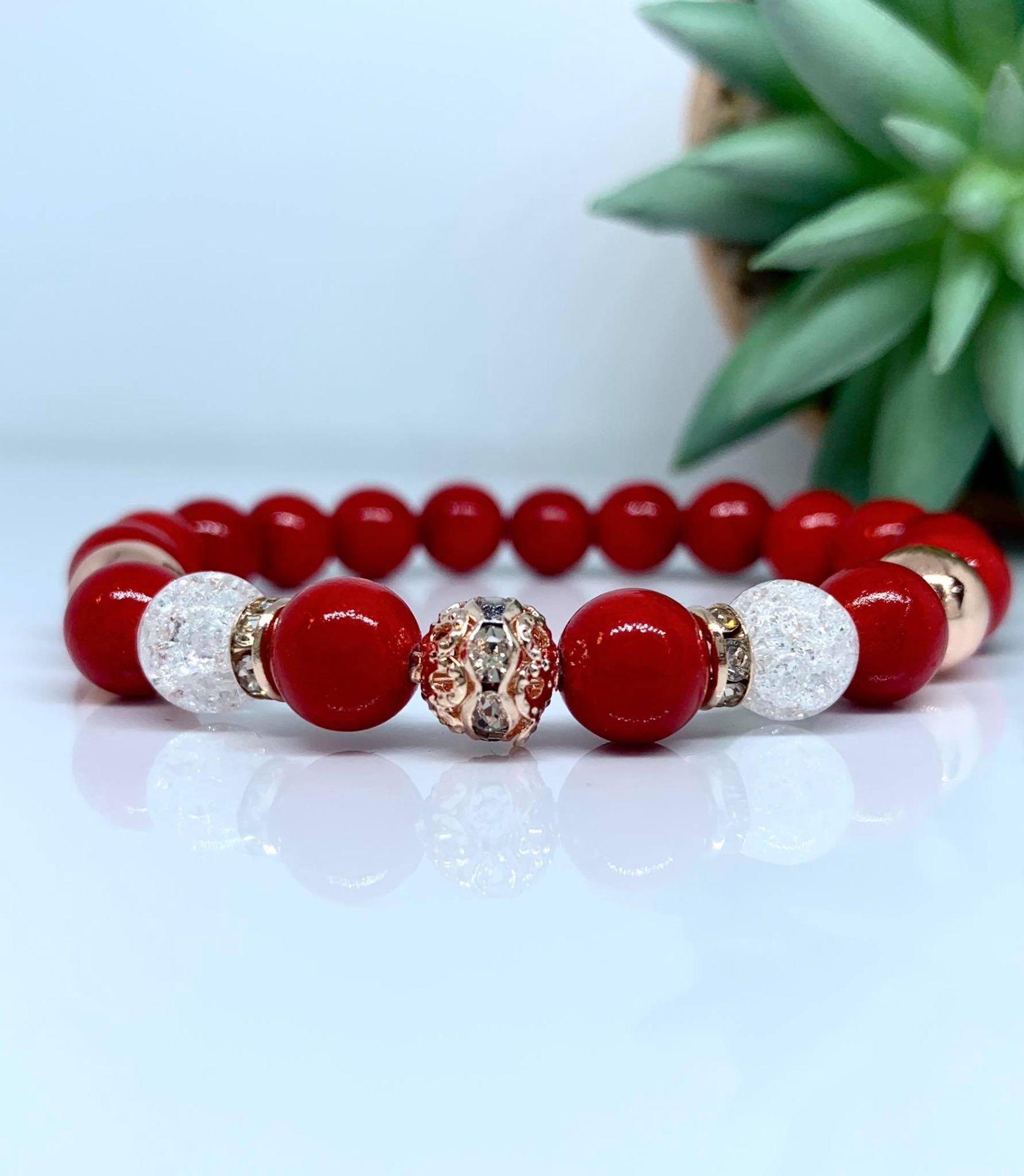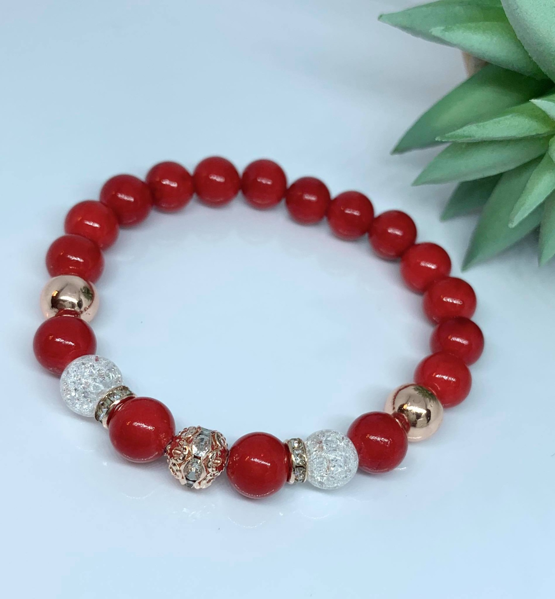 Piros & Hegyikristály Ásvány karkötő / Rose Gold strasszos köztessel