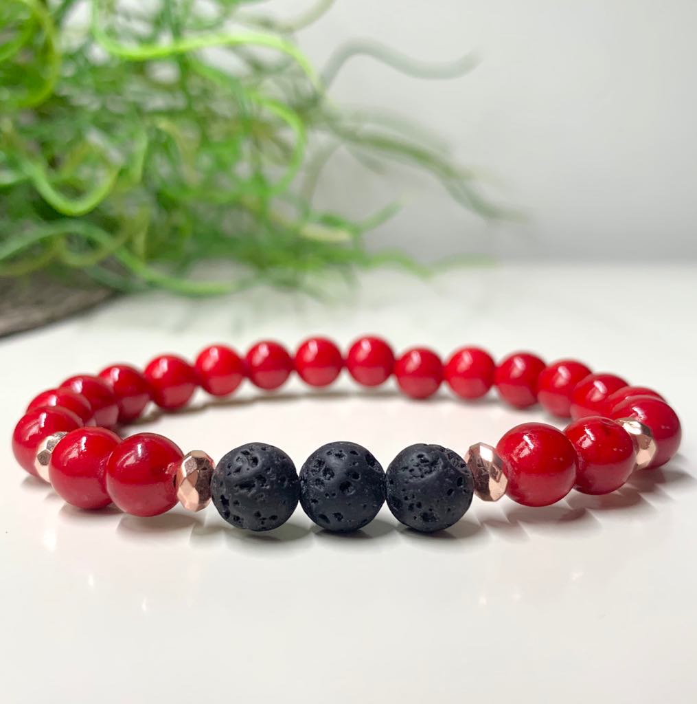 Piros Jade ásvány karkötő, Lávakővel díszítve