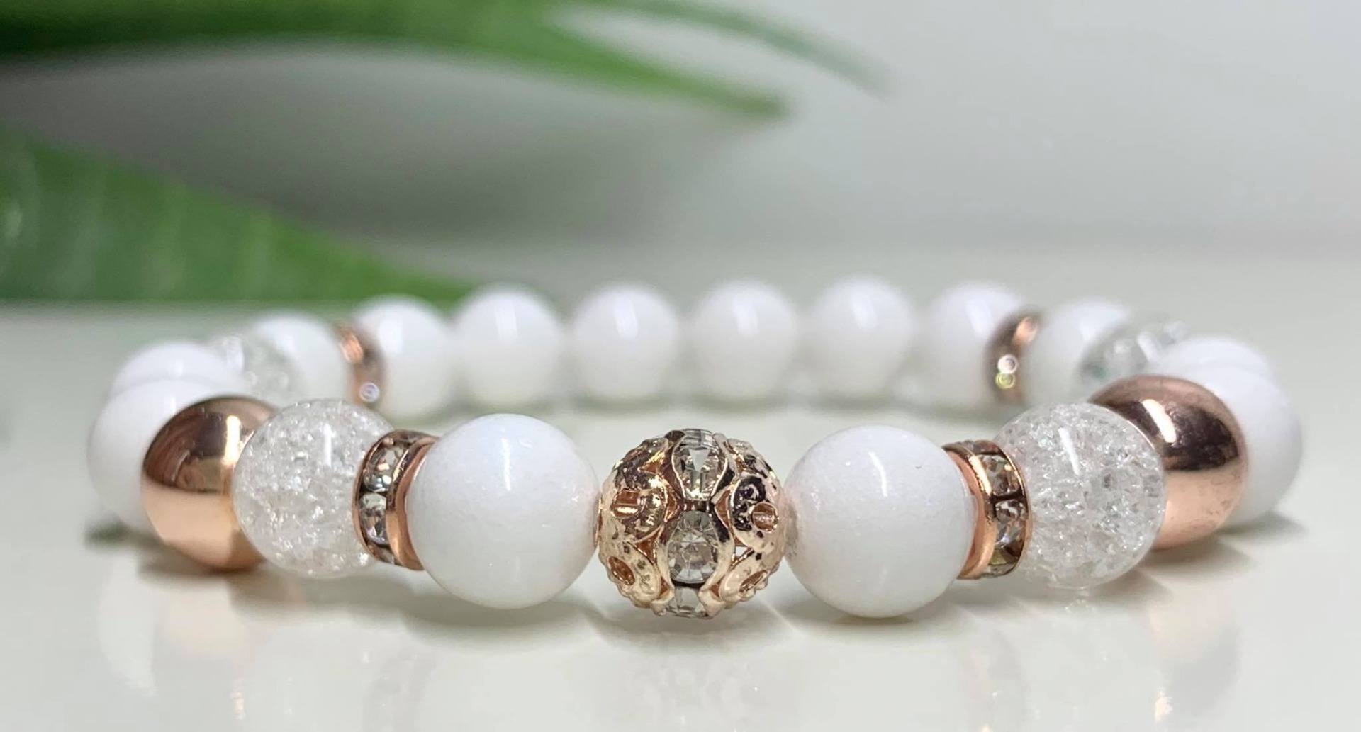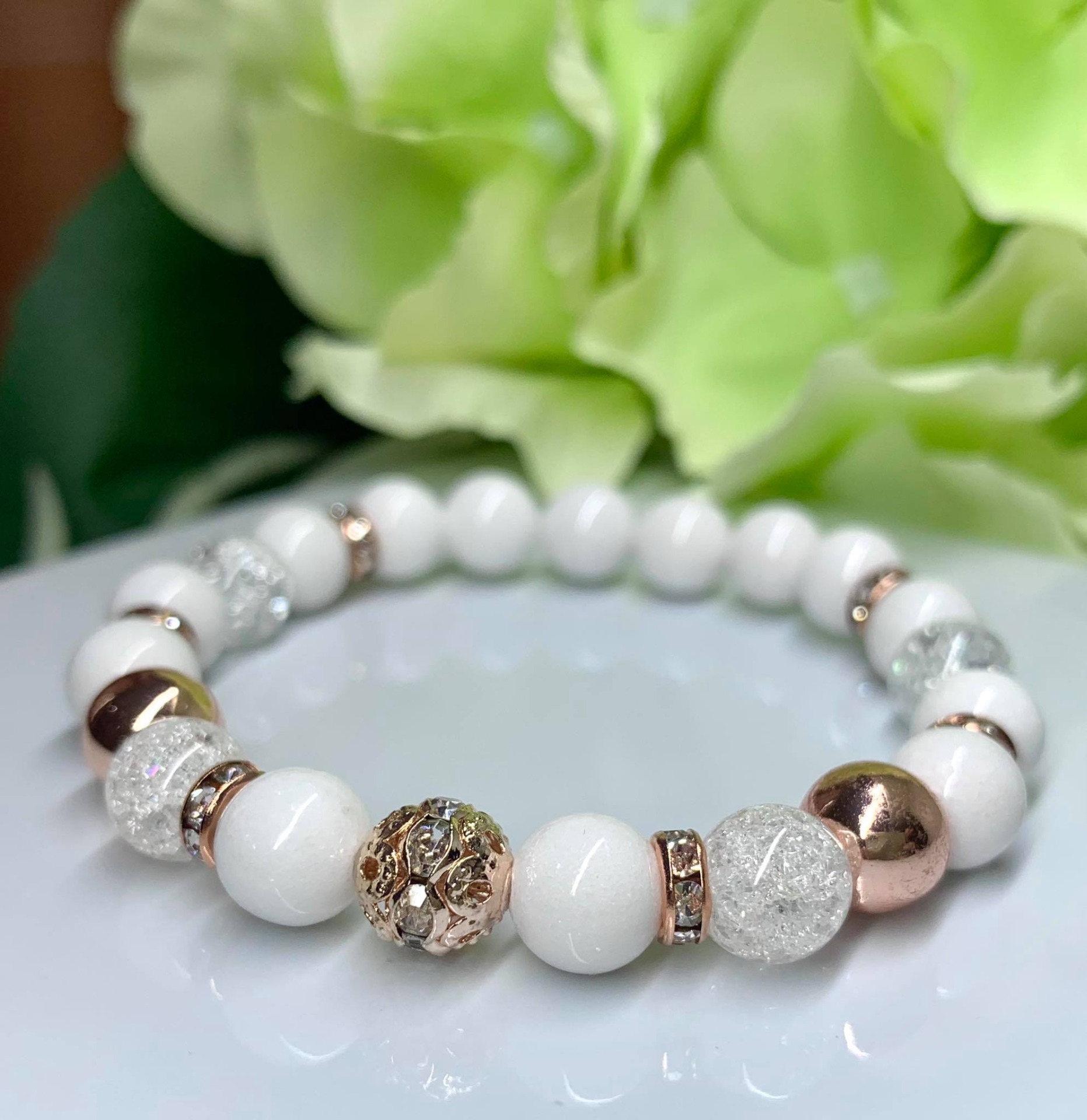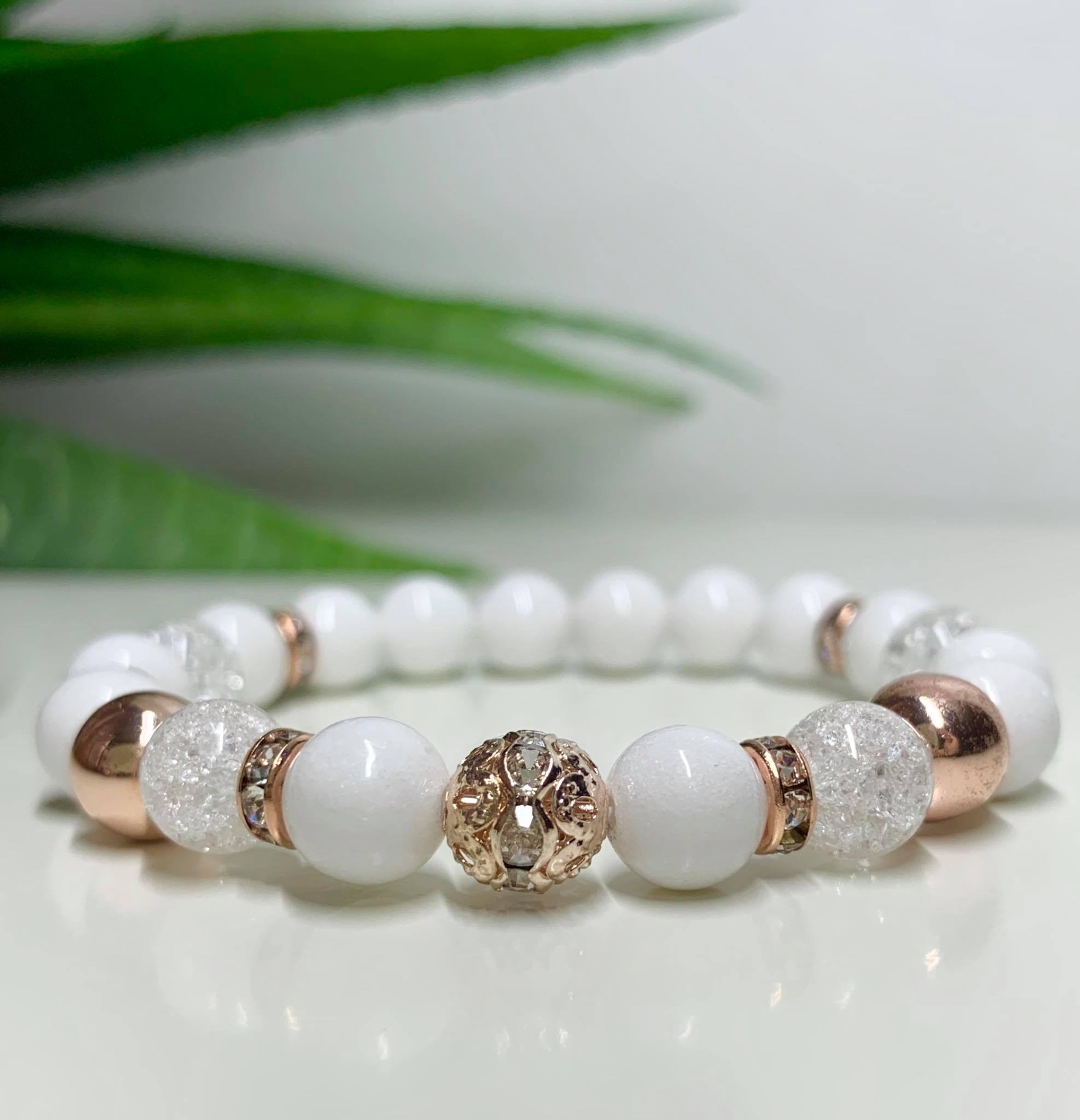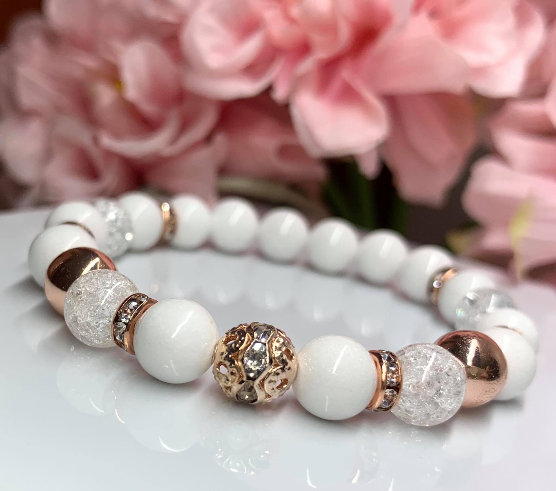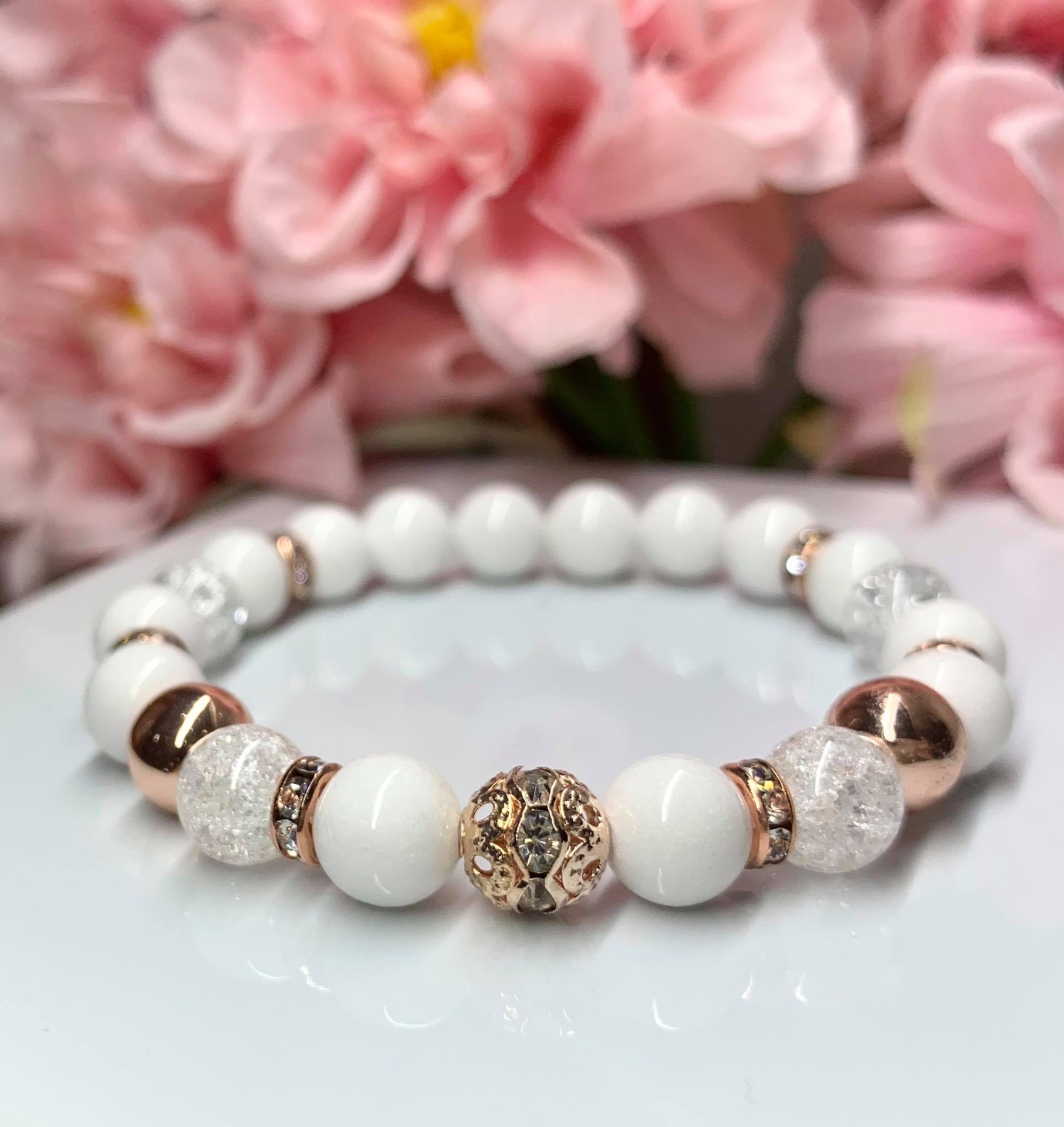 Rose Gold- Fehér Ásvány karkötő / Rose Gold Hematittal,és Hegyikristállyal kombinálva