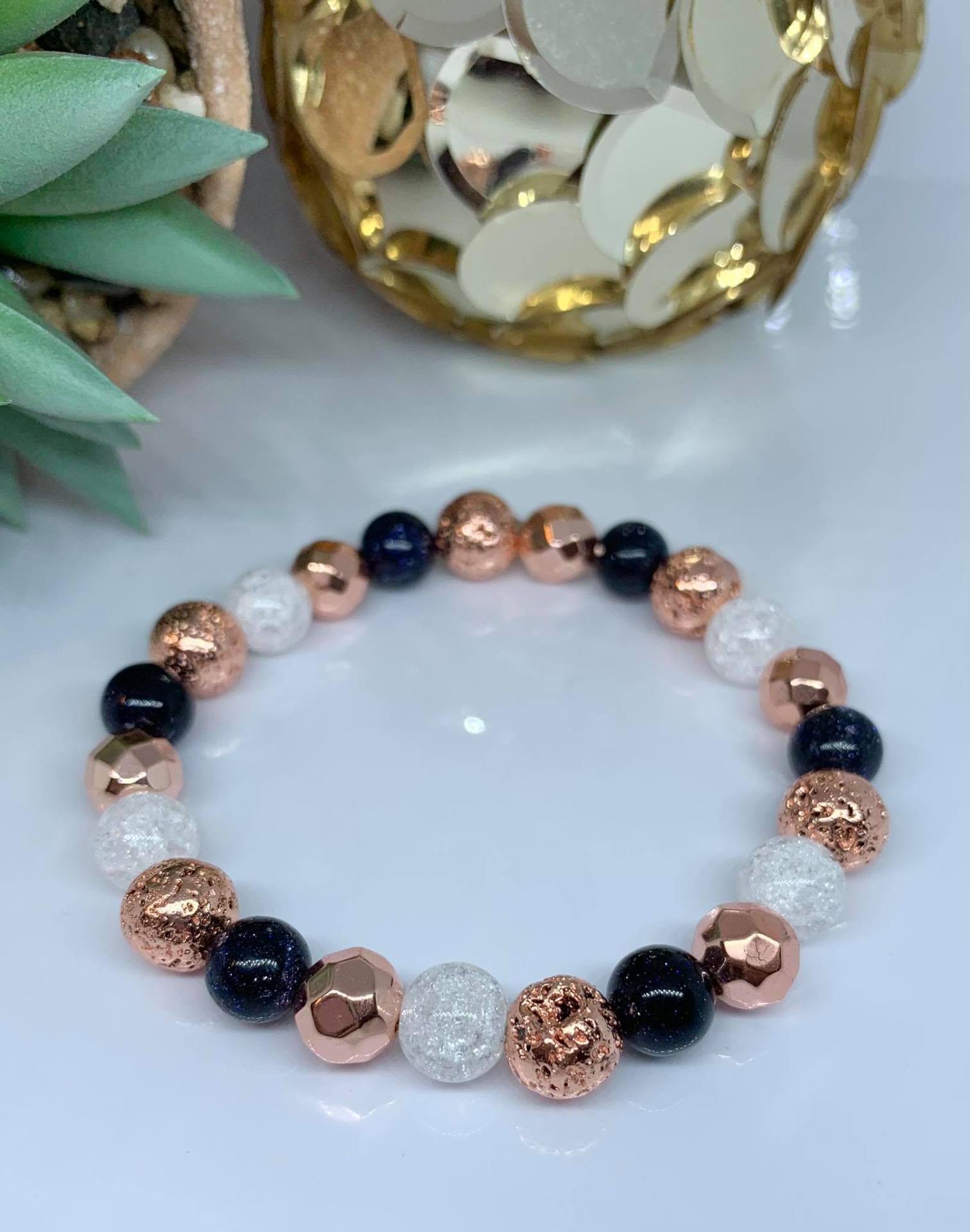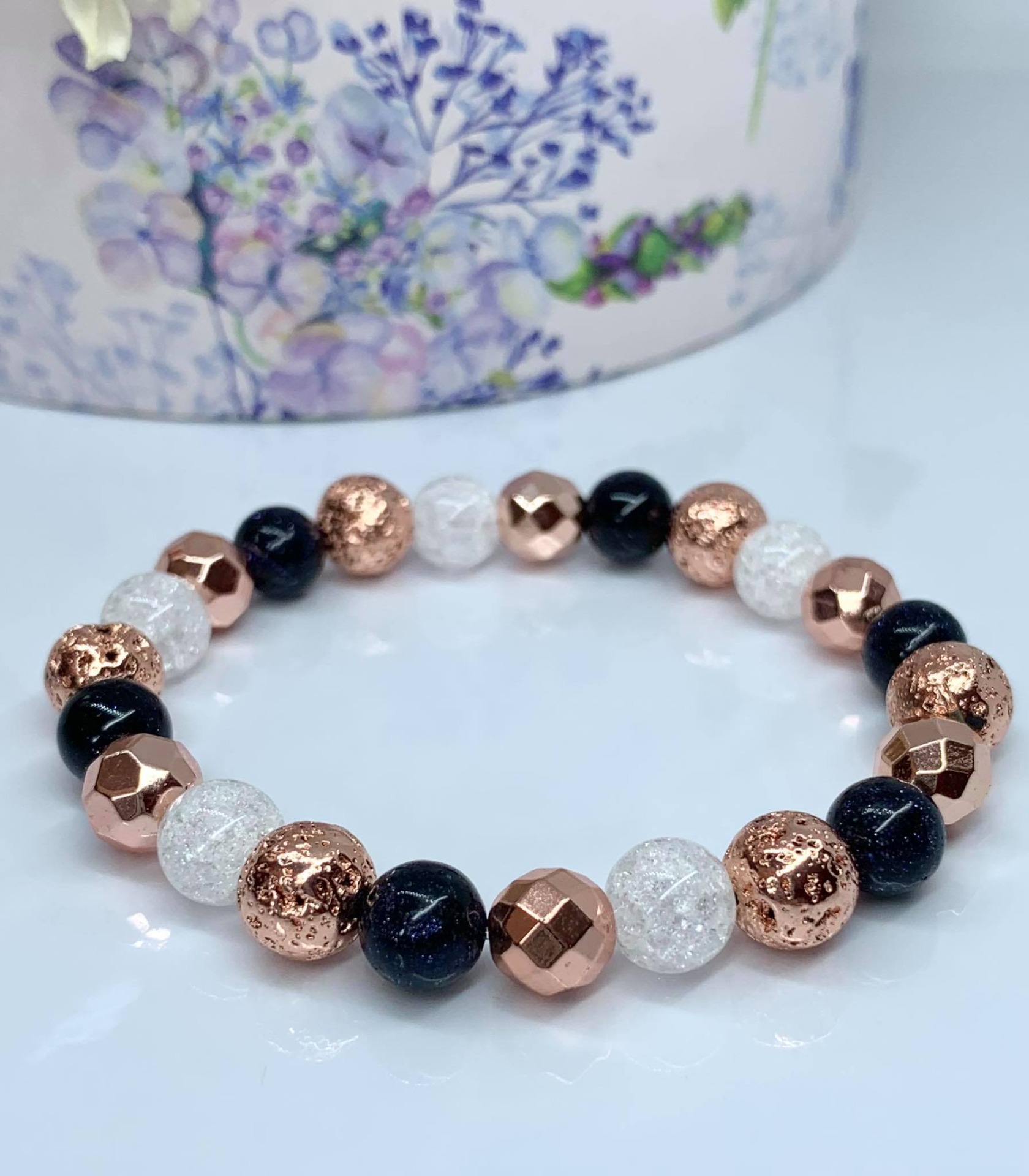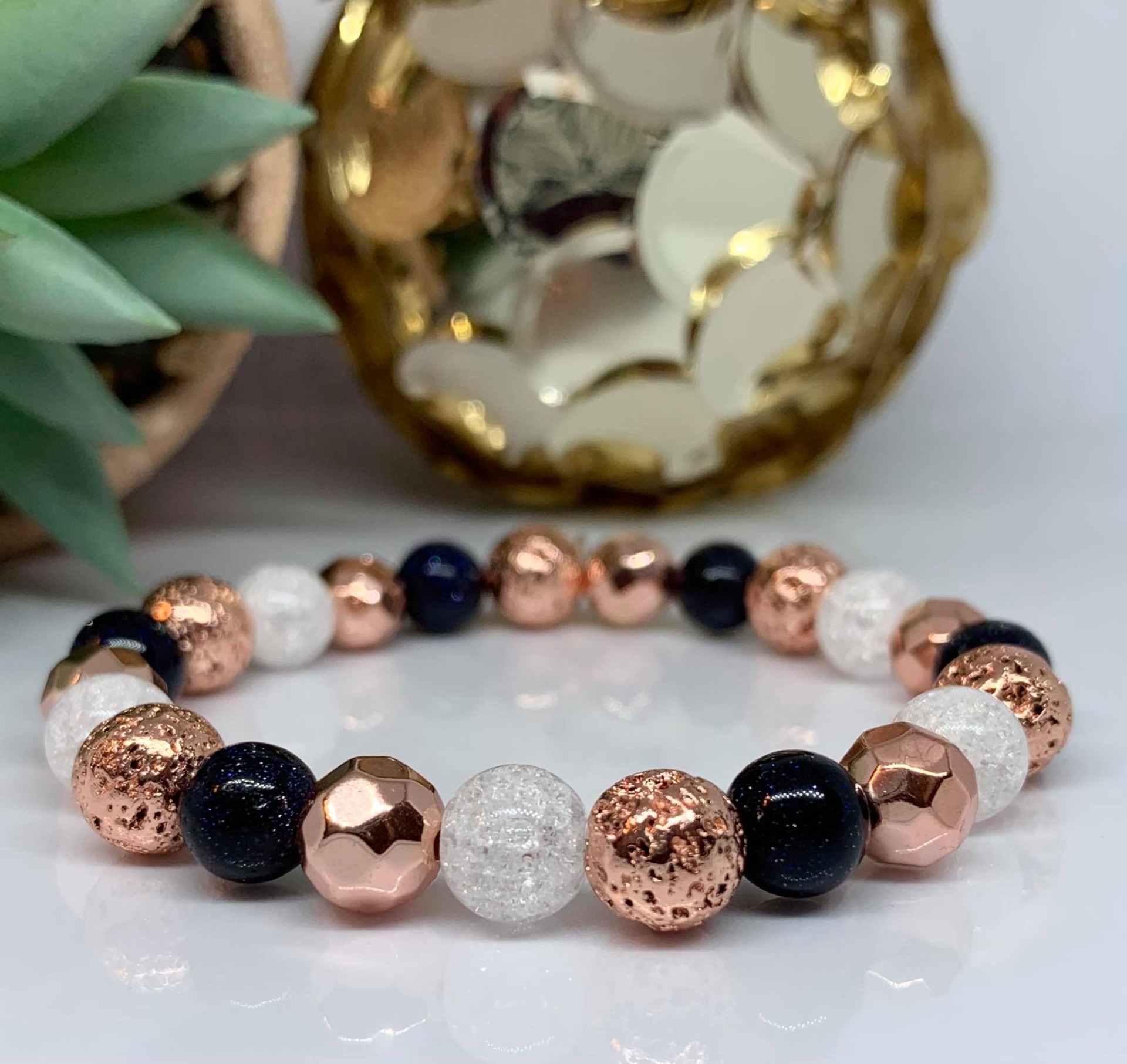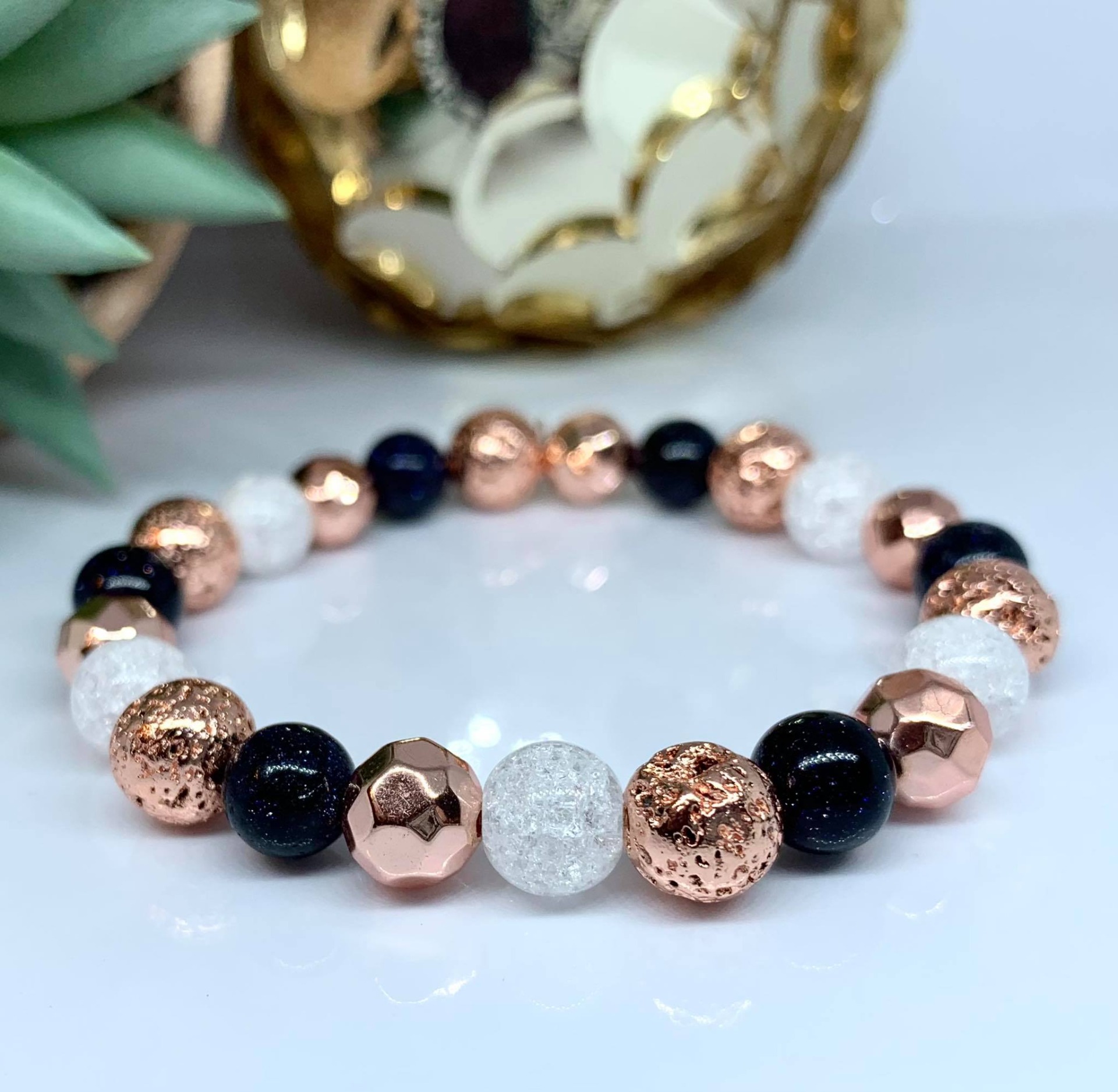 - Ásvány : Hematit (RoseGold színre festett, fazettált), Lávakő (RoseGold színre festett!), Hegyikristály (roppantott) és Napkő (csillámos)