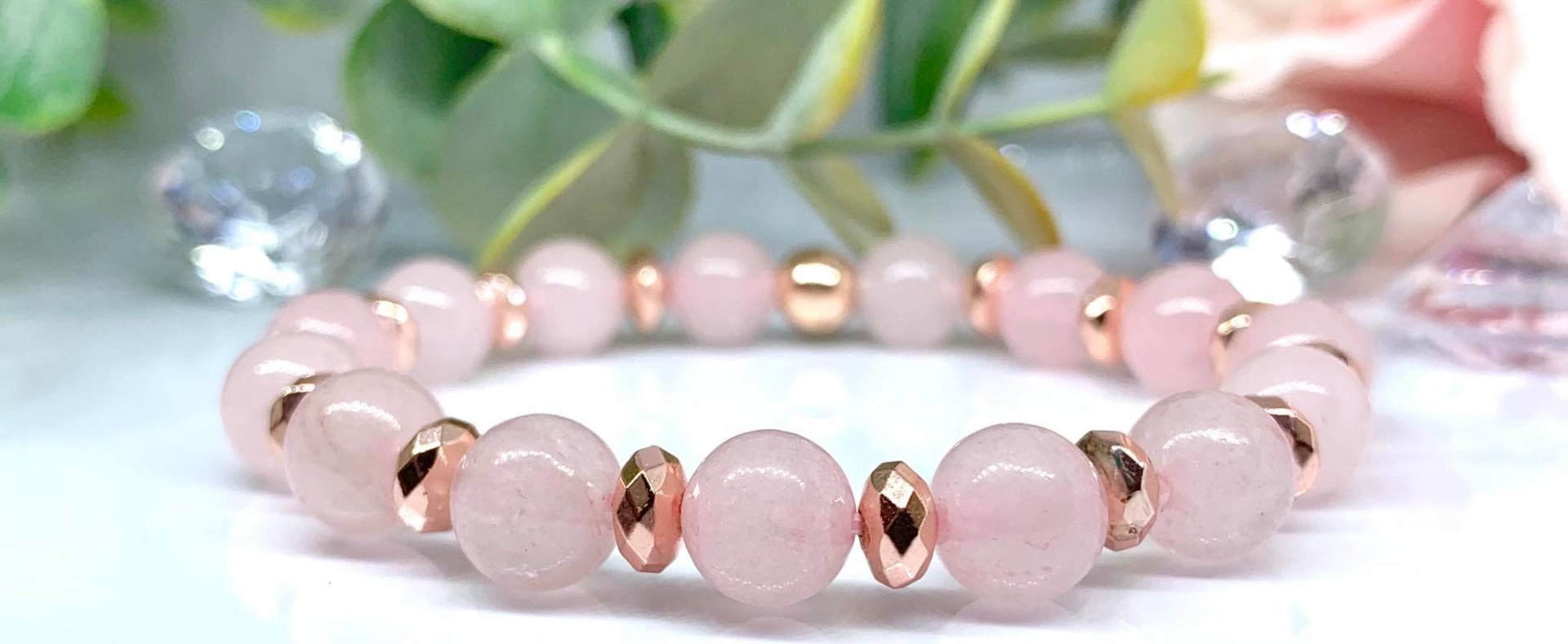 Rózsakvarc Ásvány karkötő, Rose Gold Hematit köztesekkel díszítve