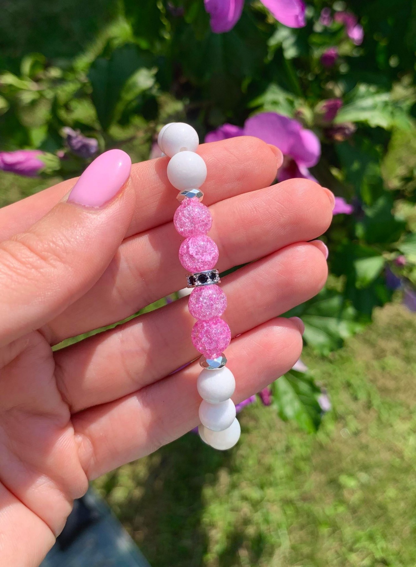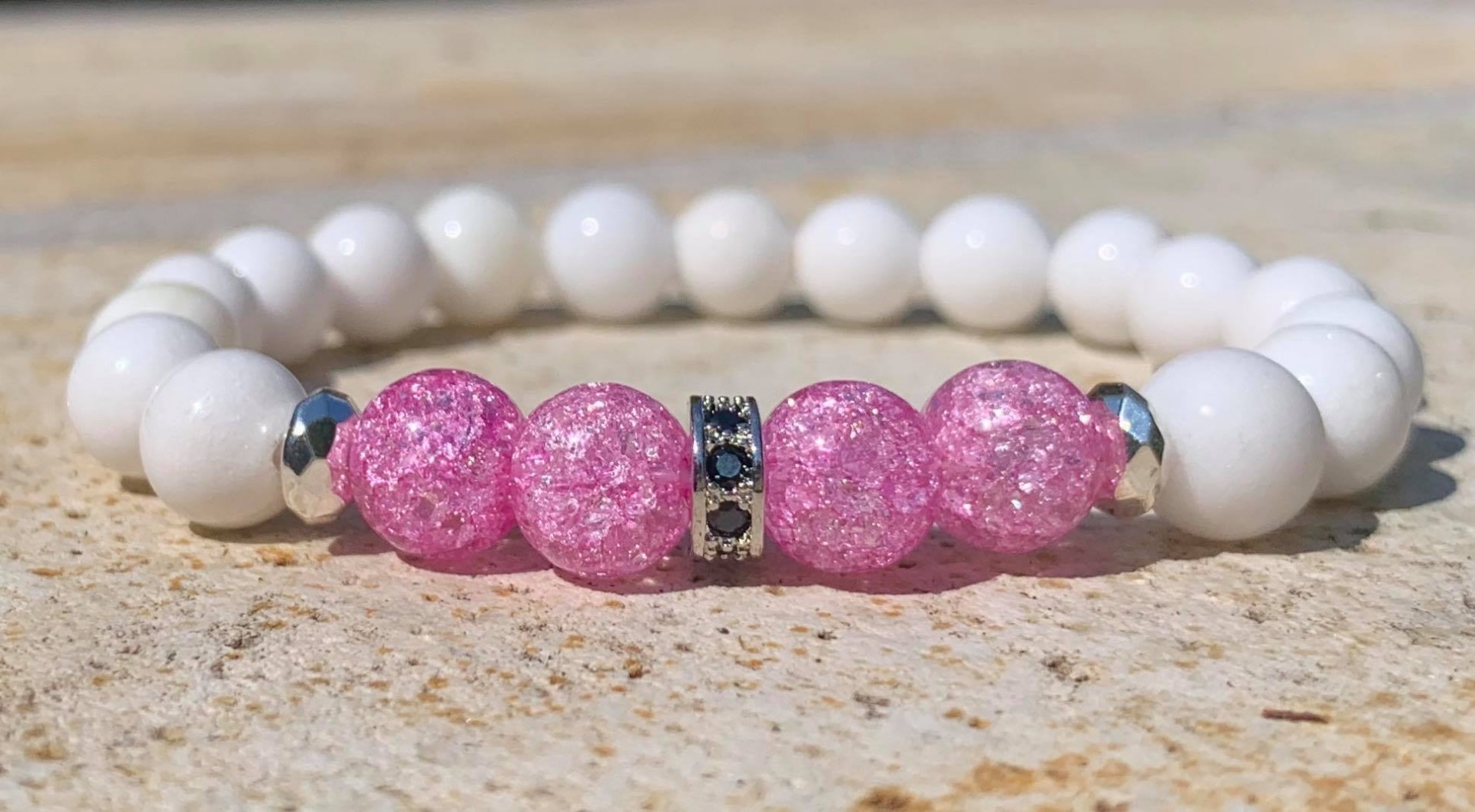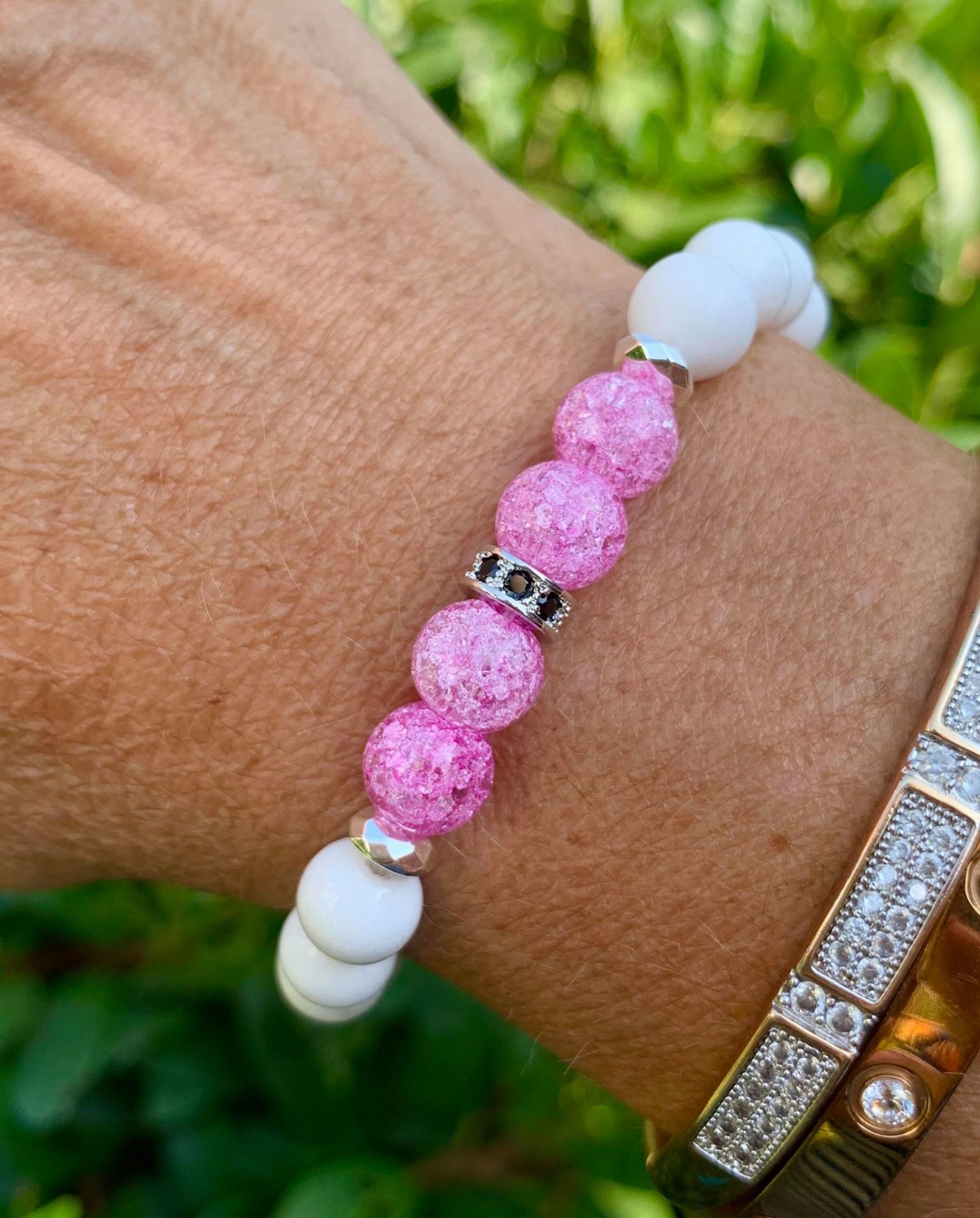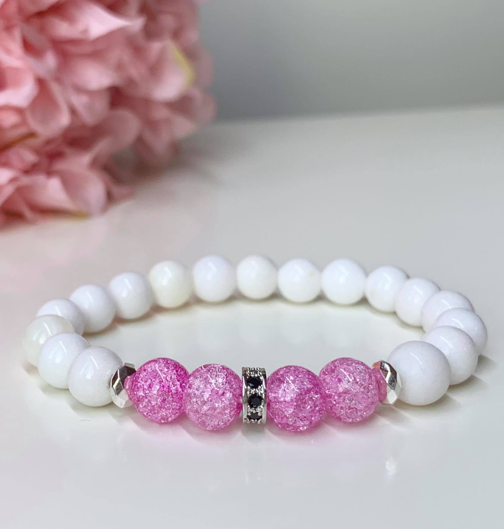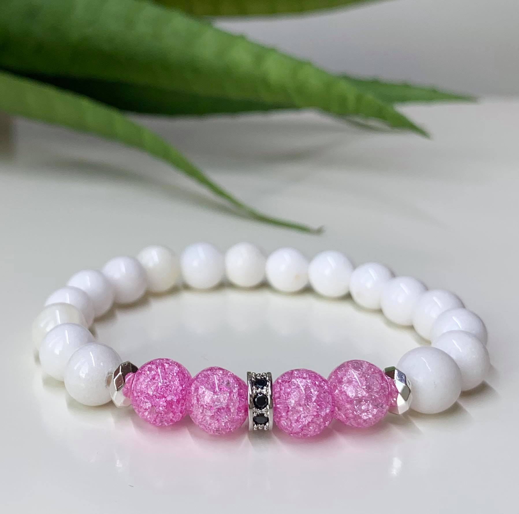 Rózsaszín Hegyikristály & Jade Ásvány Női Karkötő, Cirkon köztes díszítéssel