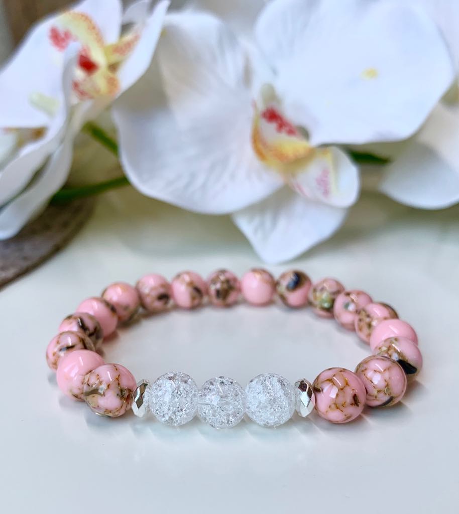Rózsaszín Préselt Kagylógyöngy Karkötő, Hegyikristállyal díszítve