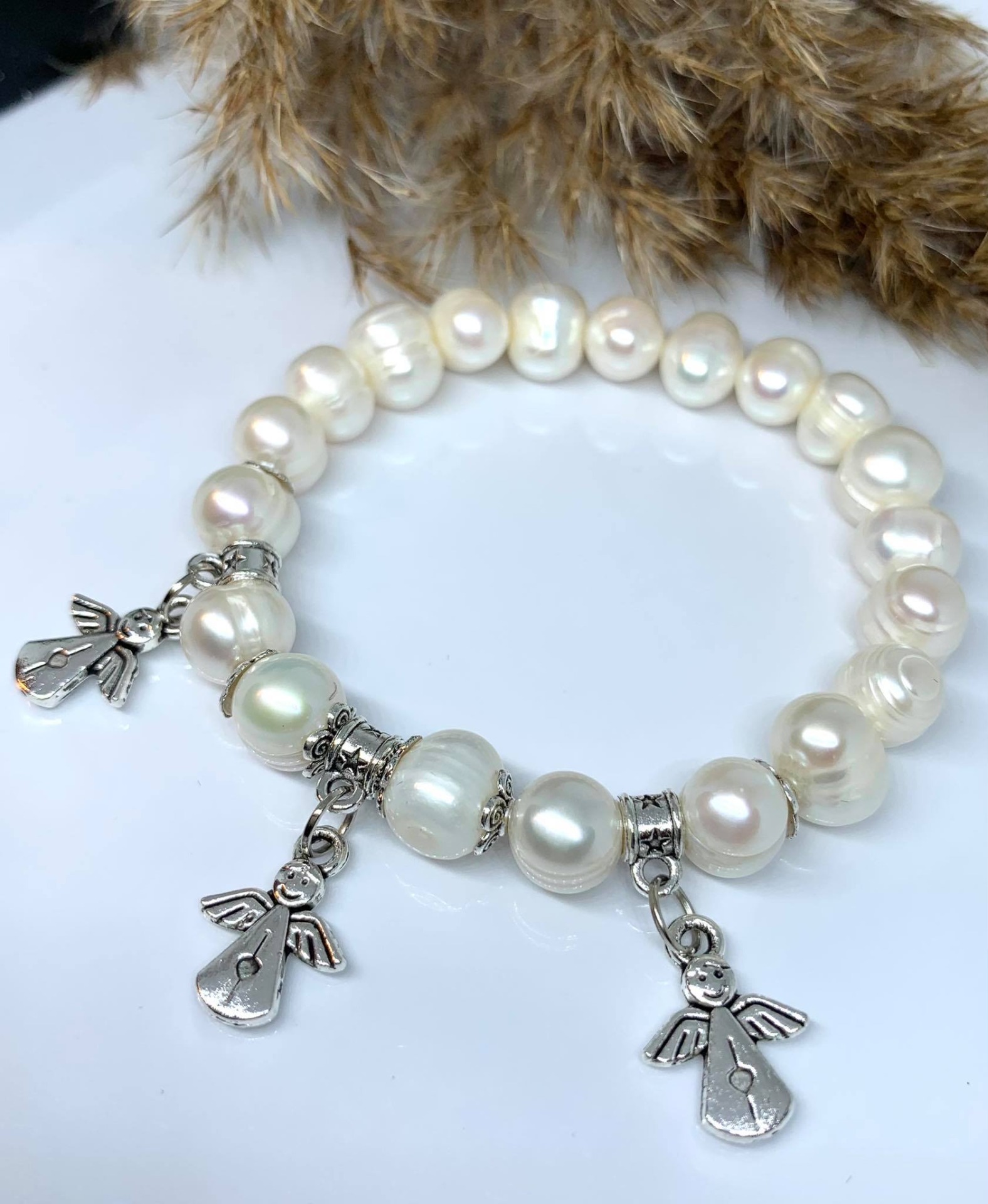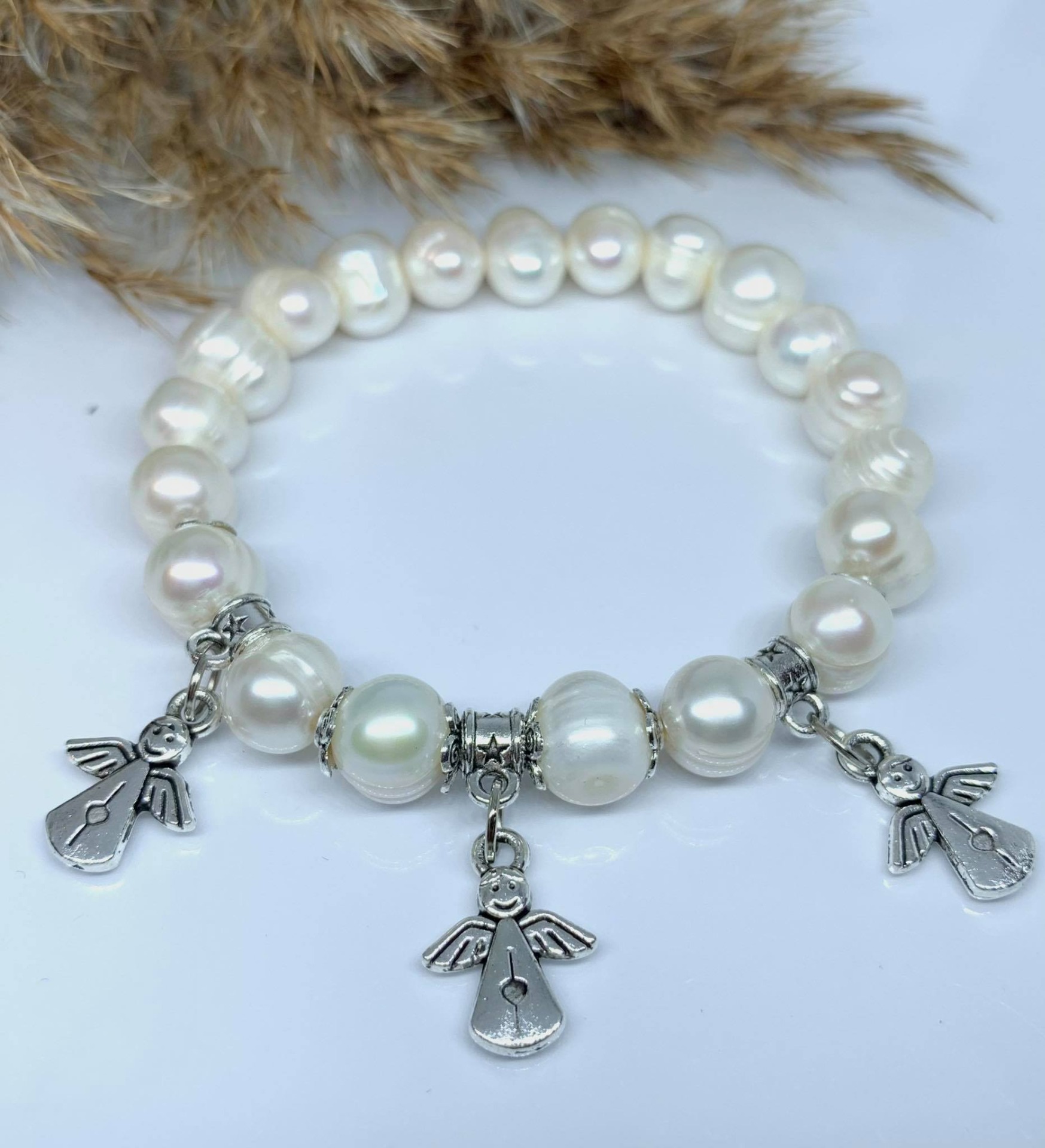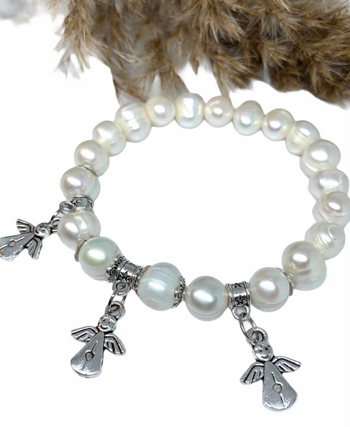 Tenyésztett kagylógyöngyös karkötő, angyalka medálollal