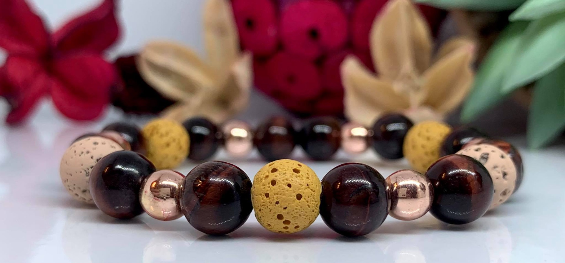 - Ásvány : Tigrisszem, Lávakő (mustár sárga és púder,festett), Hematit (rose gold festett, 6 mm-es gyöngy)
